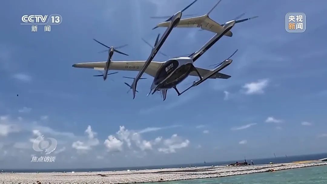 这是我国自主研发的吨级以上电动垂直起降航空器,首次实现远海石油平台物资运输飞行。