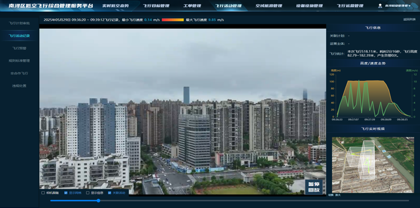 飞行前,严格执行计划申请审批与放飞申请审批流程,细致规划航线与任务细节;飞行中,通过实时飞行监视跟踪、动态告警提醒、应急处置响应、情报服务支持及碰撞监测防护,为无人机打造 “空中护航屏障”;飞行后,自动输出详尽报表、完成运行数据统计、实现信息汇聚上报、做好日志管理归档并生成专业飞行报告,形成闭环管理链条。