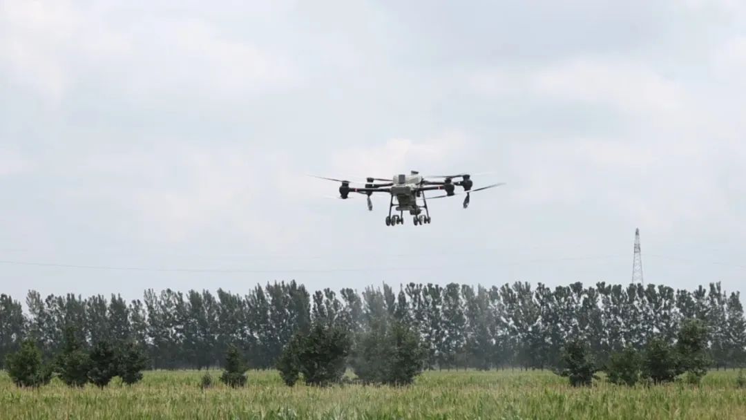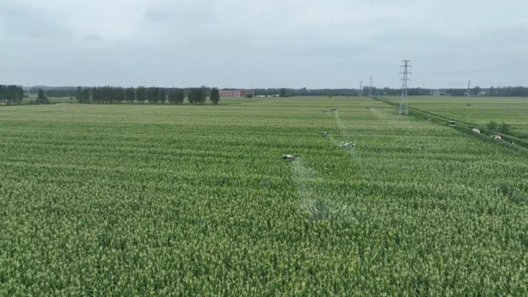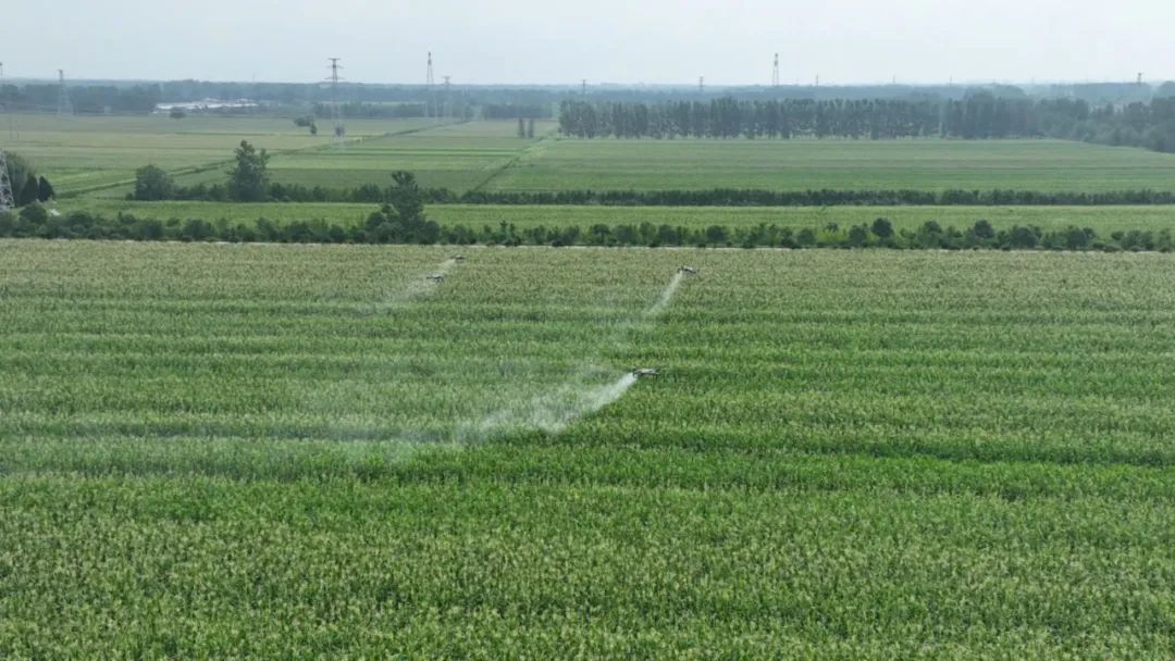 一大早,在古邵镇大刘庄村玉米田上空,六台无人机正在技术人员的操控下按照预设航线平稳飞行,高效喷施叶面肥与植保药剂,为雨后玉米筑起一道科技防护屏障。