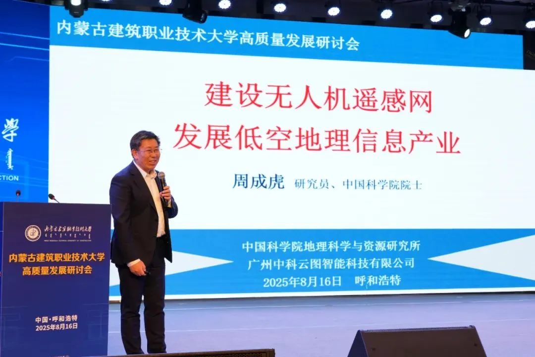 中国科学院院士周成虎参加揭牌仪式,并为高质量发展研讨会带来精彩主旨演讲,题为“建设无人机遥感网新基建 发展低空地理信息产业”,为低空经济未来发展路径提供深度解读。