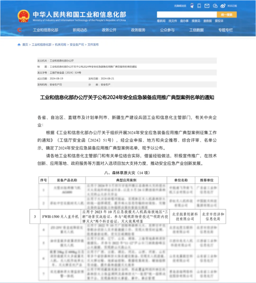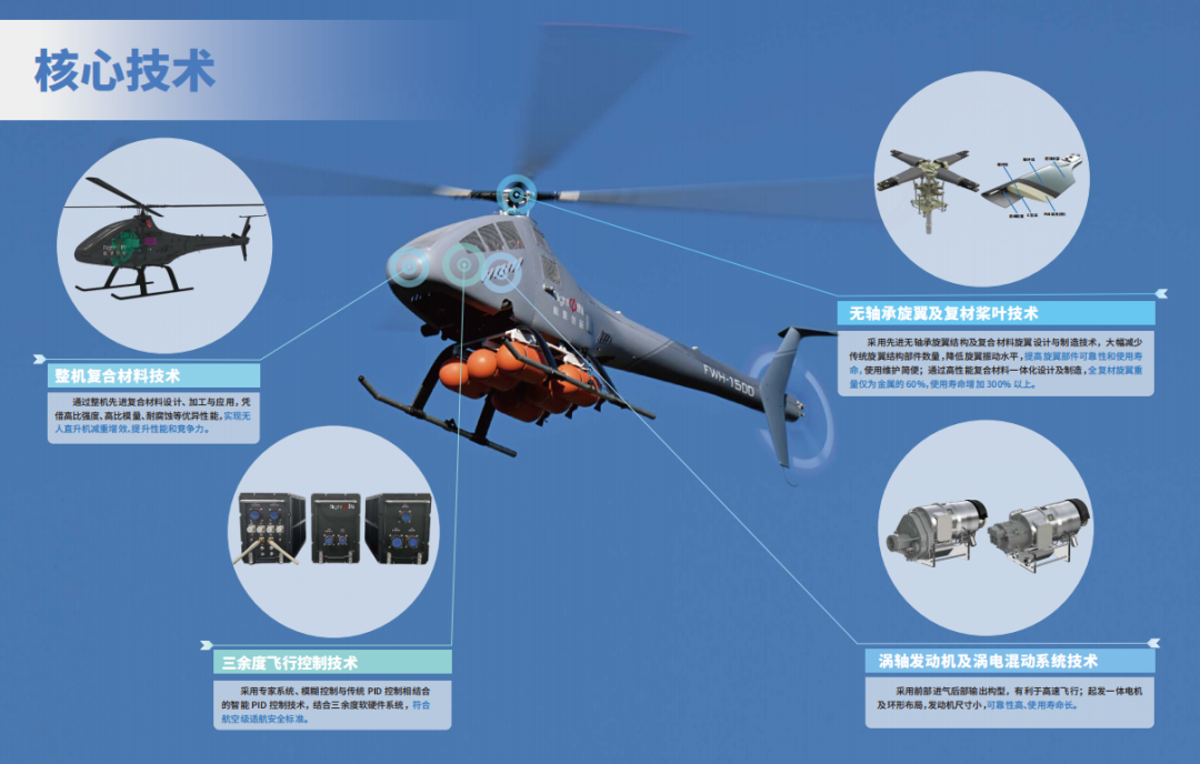 FWH-1500无人直升机被北京市科学技术委员会评为新技术新产品和首创产品、上榜国家工业和信息化部“2024年安全应急装备应用推广型案例”和中国低空经济重大先进科技成果。