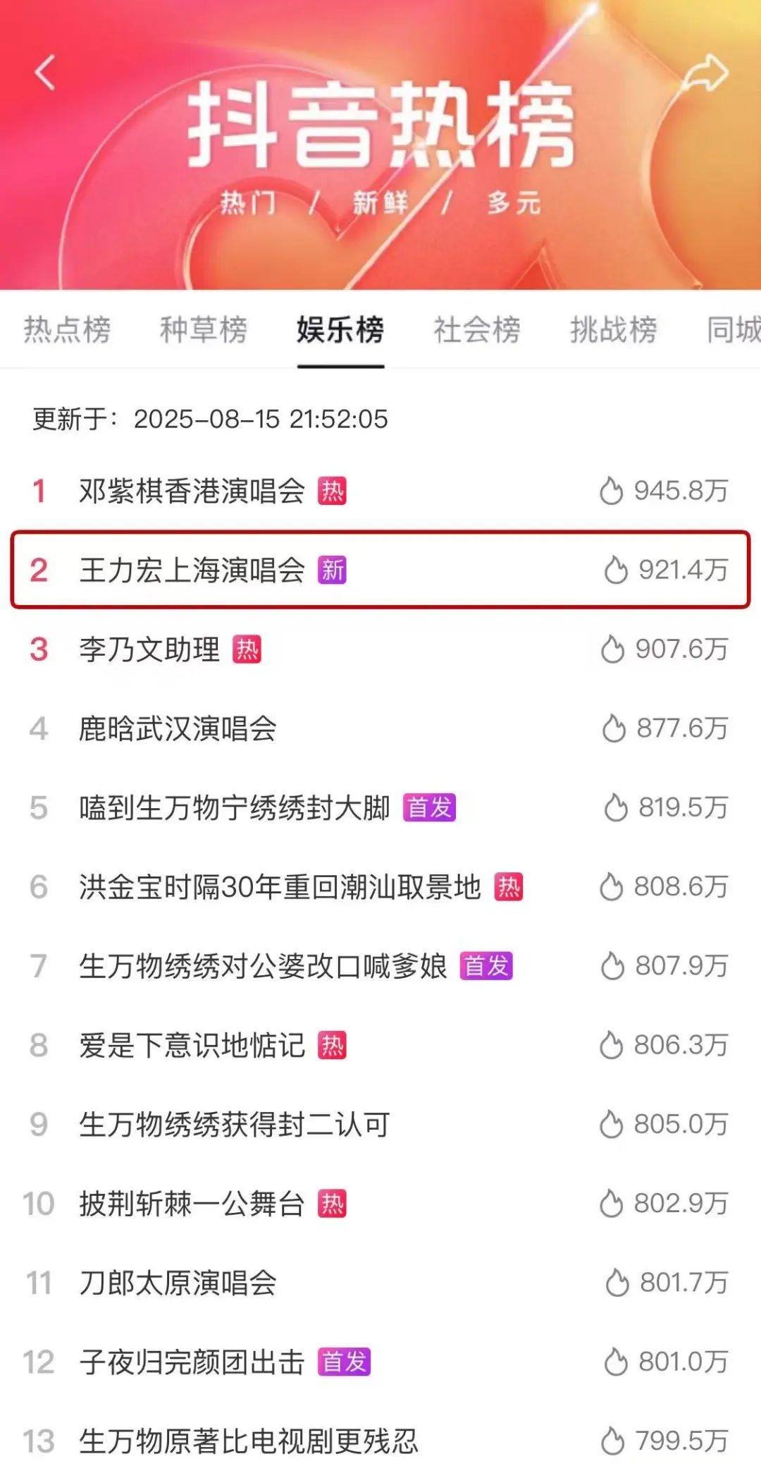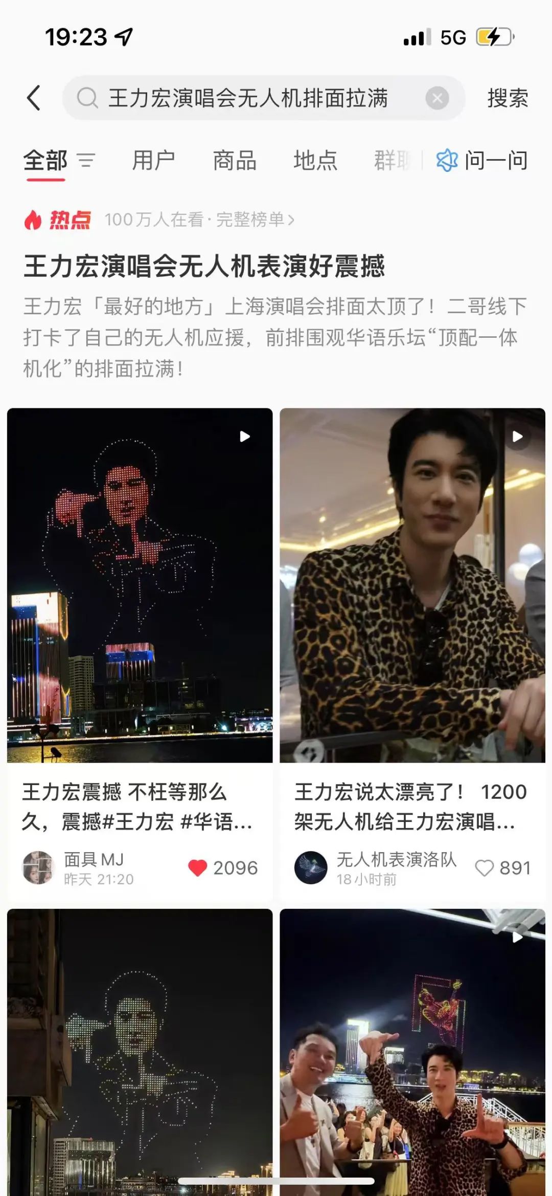 表演画面通过直播和现场观众拍摄,迅速刷屏社交媒体,抖音相关片段播放量3小时破亿,#王力宏上海演唱会无人机排面拉满#等话题迅速登上热搜榜,相关话题阅读量狂飙至5亿。