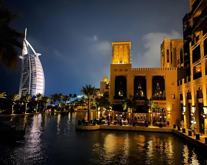 沿水上通道乘坐阿布拉小船缓缓穿行于仿古城堡之间,岸边椰林摇曳、灯火初上,仿佛穿越到千夜之城。探索风情市集、艺术长廊与海湾观景台,尽览阿拉伯湾的余晖波光。随后在水岸边餐厅享用晚餐,美味佳肴与阿拉伯园林的交织氛围 ,让一日的行程在味觉与视觉的双重享受中缓缓落幕。
