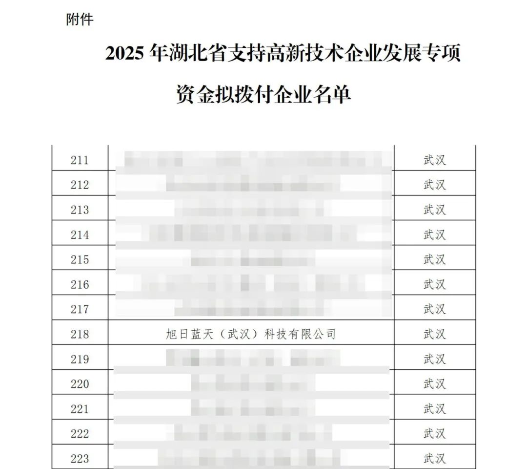 近日,湖北省科学技术厅发布了《关于2025年湖北省支持高新技术企业发展专项资金拟拨付企业的公示》,旭日蓝天(武汉)科技有限公司凭借在科技创新领域的卓越表现,成功入选该名单!这一荣誉不仅是对旭日蓝天过去努力的高度认可,更是对公司未来发展的强大激励。