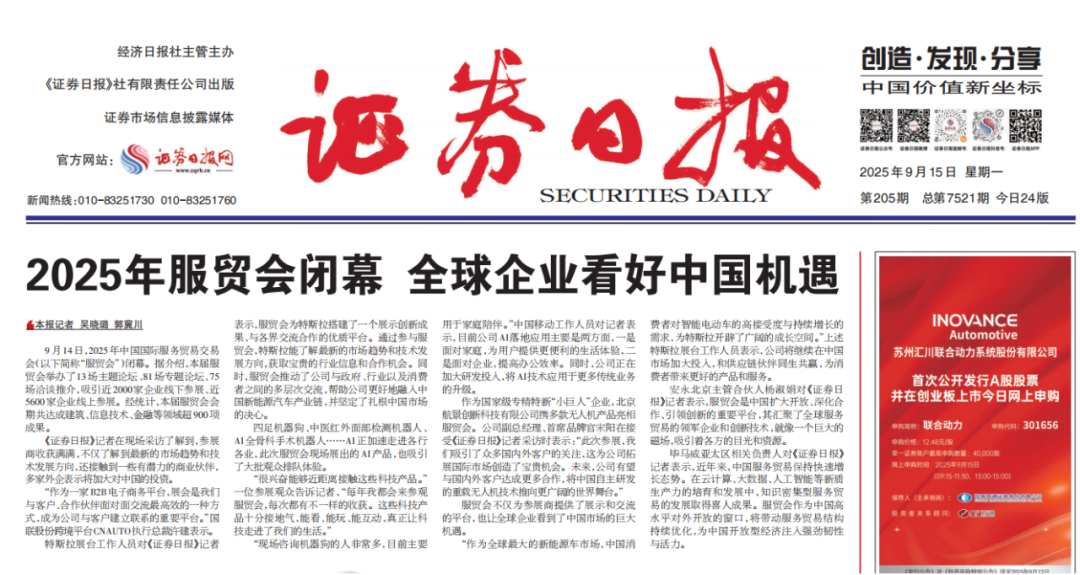 《证券时报》报道:2025年服贸会启幕:中国服务携硬科技+软经验出海,为全球经济注入新动能