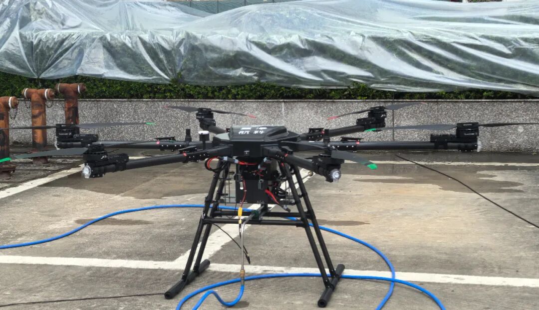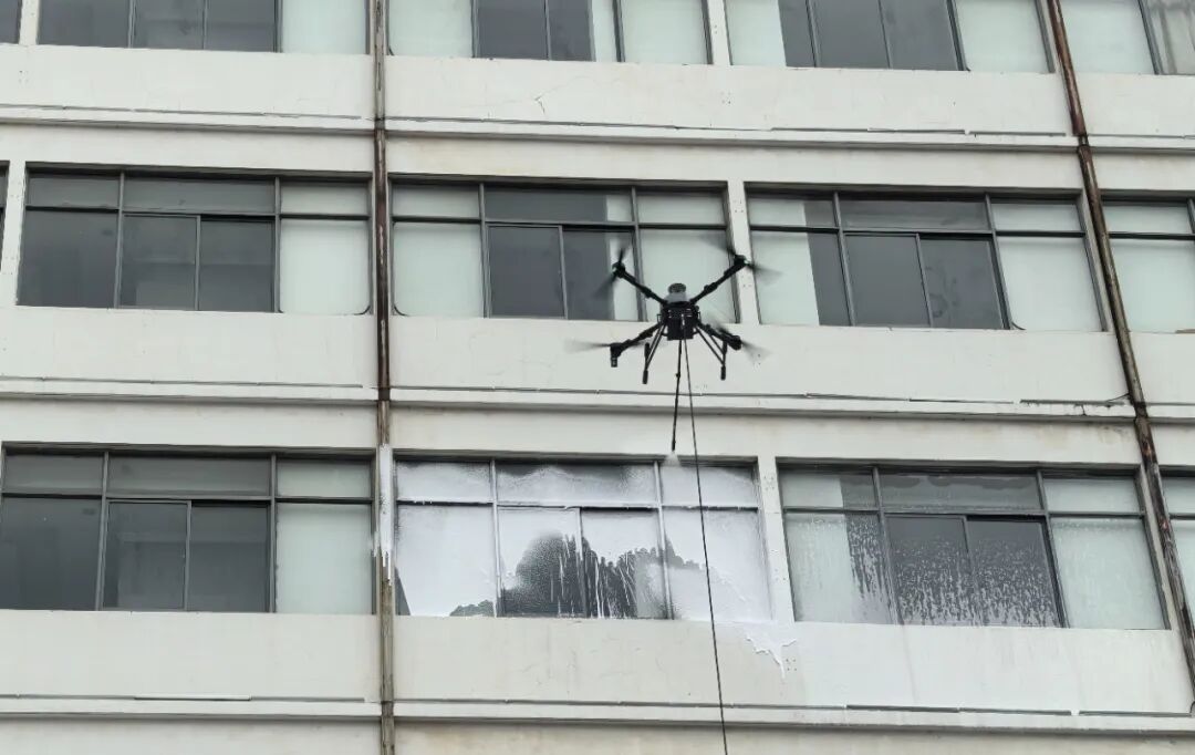 9月20日上午,在芜湖市湾沚区某办公大楼外,一场无人机高空喷淋清洗幕墙的实地演示顺利完成。两架搭载高压水枪和风炮的系留无人机,在百米高空精准悬停,对建筑外墙玻璃进行全面清洗。相比传统人工方式,无人机清洗不仅大幅提升效率,也显著降低高空作业风险。