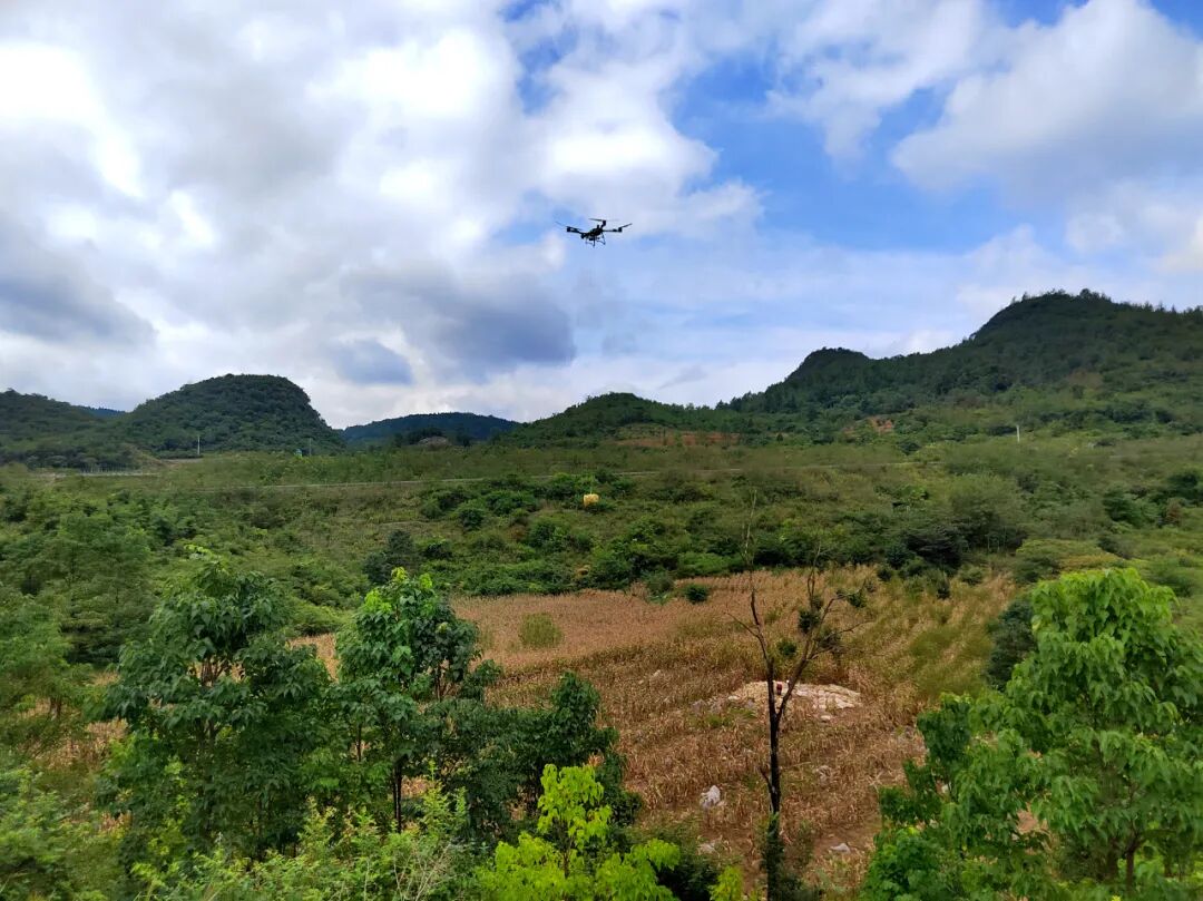 9月19日清晨,在清镇市王庄布依族苗族乡蚂蟥村,玉米地上,一袋袋金黄的玉米“整装待发”,正等待该市黔耘农机专业合作社的无人机前来吊运——只需一分钟左右,无人机就能载着玉米飞越百米到达卸货点。
