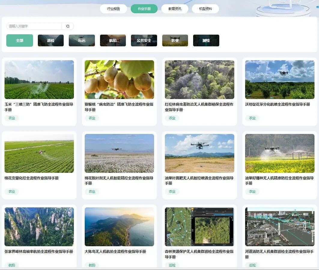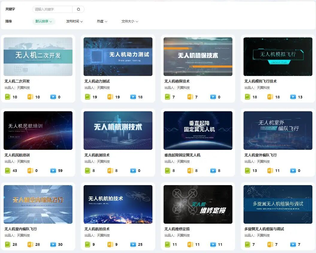 自研模块课程库共计沉淀天翼自研课程12门,涵盖无人机实训教学、无人机行业应用等各类课程,未来会持续更新新课程模块;