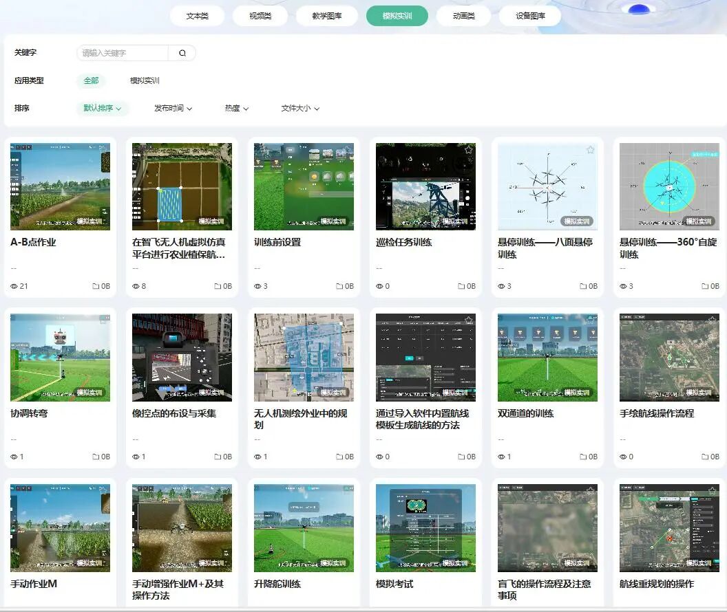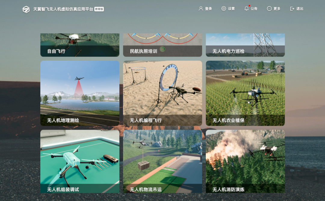 天翼智飞虚拟仿真应用平台,构建高逼真、强交互、广覆盖的无人机虚拟实训环境,覆盖“装 - 调 - 修 - 飞 - 用 - 研”六大教学内容,开发组装调试、电力巡检、地理测绘、农业植保等十大仿真项目,支撑院校申报职业教育示范性虚拟仿真实训基地。