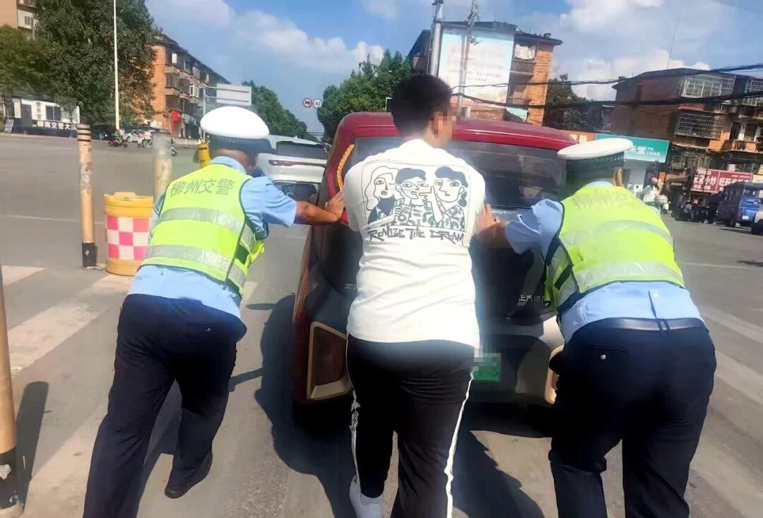 10 月 4 日 10 时 25 分,柳南大队辅警朱懋波、覃昱才在鹅山路红岩路口执勤,发现李先生的新能源小 E 因电力故障停在坡道中央,困住车主且致后方拥堵。