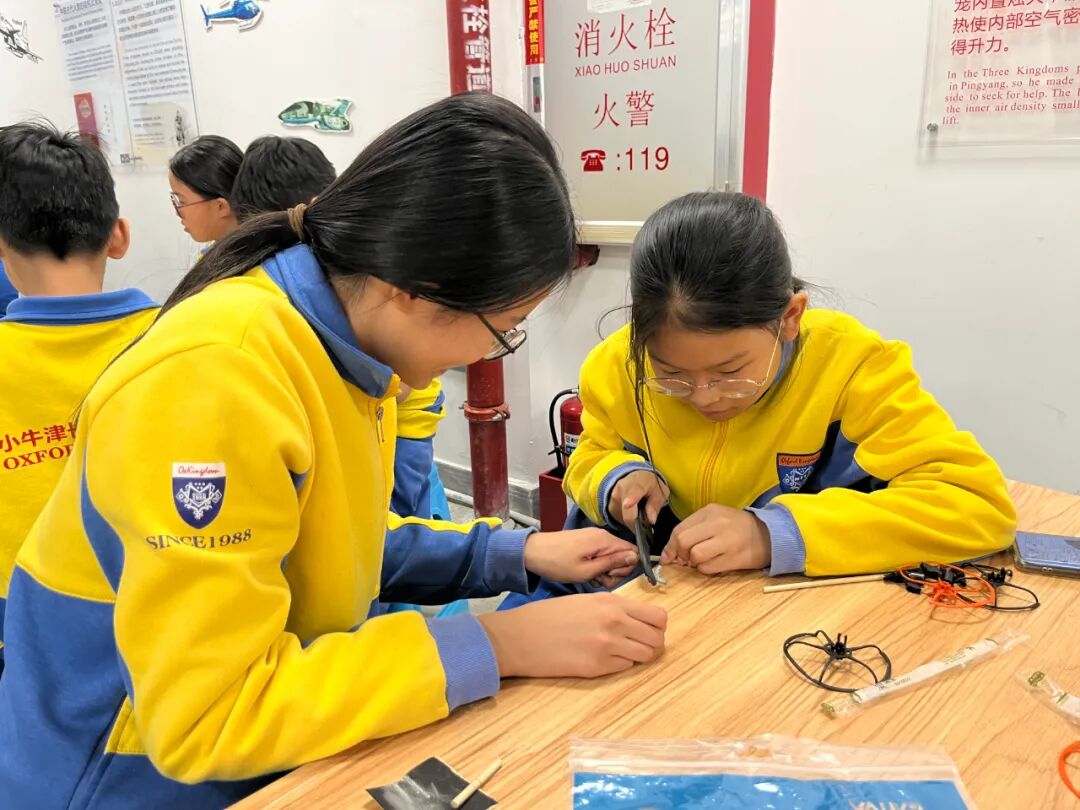 筷子无人机制作环节孩子最喜爱。孩子们分工裁剪筷子、安装电机与桨叶,连调皮的男生都格外专注。当亲手组装的无人机升空,一张张笑脸映着蓝天,满是创造的喜悦。