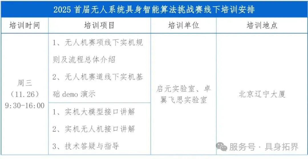 为了构建整为提升参赛选手在无人机赛道中的实机操作与算法调试能力,大赛组委会将于11月26日,在北京辽宁大厦举办为期一天的无人机赛道线下实机培训。本届培训由启元实验室及飞思实验室强力赋能,旨在为选手备赛提供坚实保障,帮助参赛队伍深入掌握无人机系统实机组装、调试、飞控算法部署及任务执行等关键技术,强化对大模型与无人机系统融合应用的实战能力,为决赛阶段的实机任务做好充分准备。