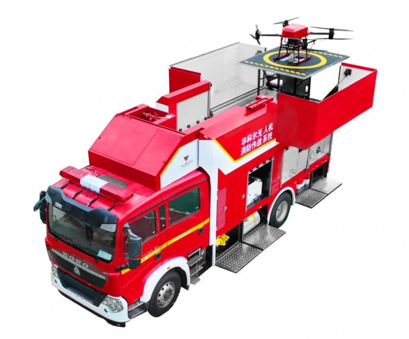 目前,华科尔推出的“机车一体”系留消防无人机,已实现350kg的有效载重,并通过地面系留发电机组实现“不间断”飞行作业。该性能已在实战化场景中得到验证——在“应急使命・2025”广东深圳高层建筑消防演习中,华科尔消防无人机凭借大载重与稳定飞控,携带水带精准升空,在高层复杂气流中稳定完成高压喷洒,均匀覆盖着火区域,有效抑制了火势蔓延。其避障系统可识别前方障碍并自动减速,确保了作业安全。