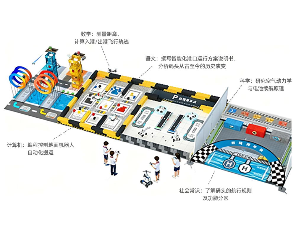 高巨创新旗下深鹏派科技兴趣班的“智慧港口”课程,便精准契合了这一需求:学生要完成无人机与地面机器人协同作业的任务,必须主动调用多学科知识——
