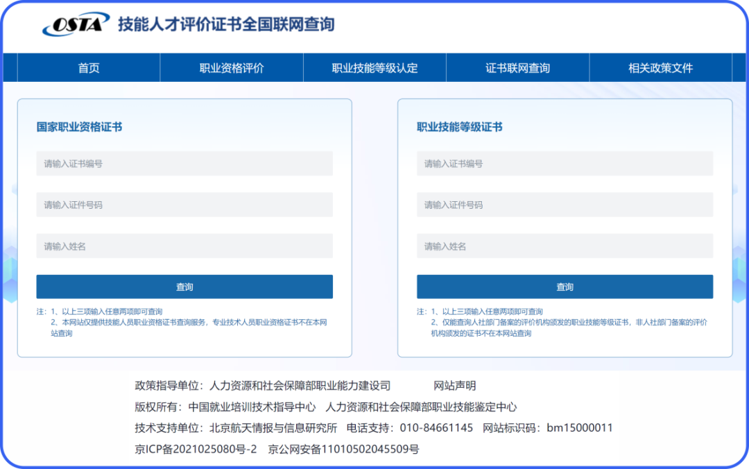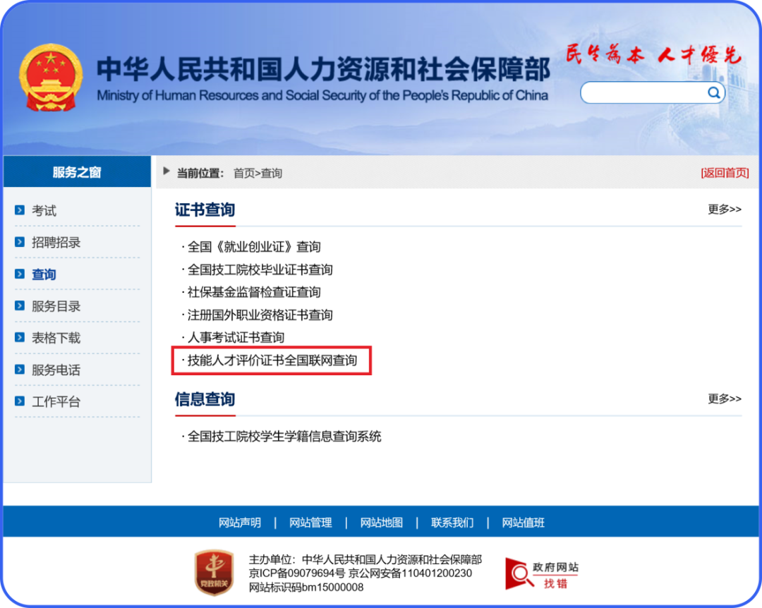 登录国家人社部官网或职业技能等级证书全国联网查询网站