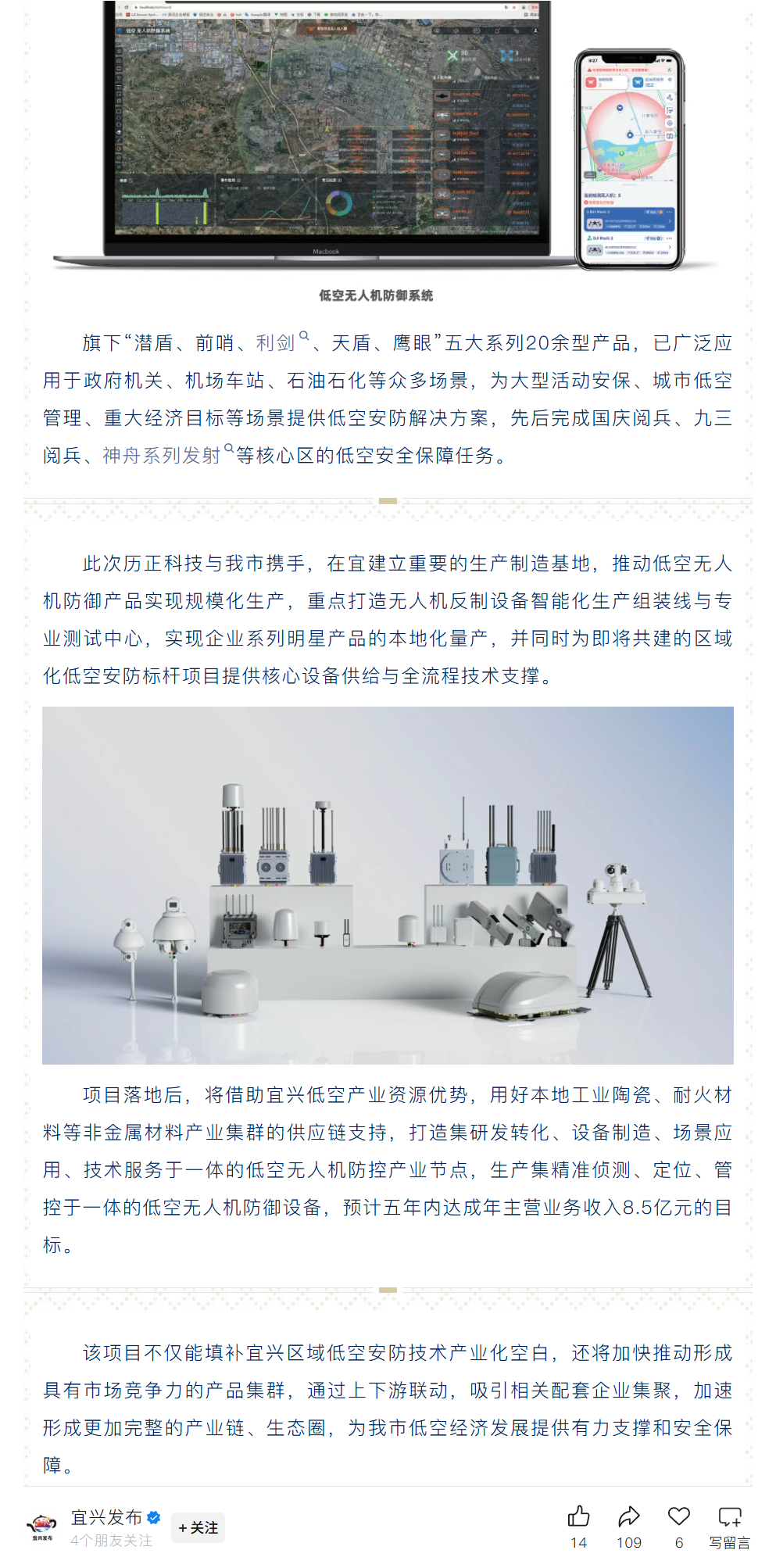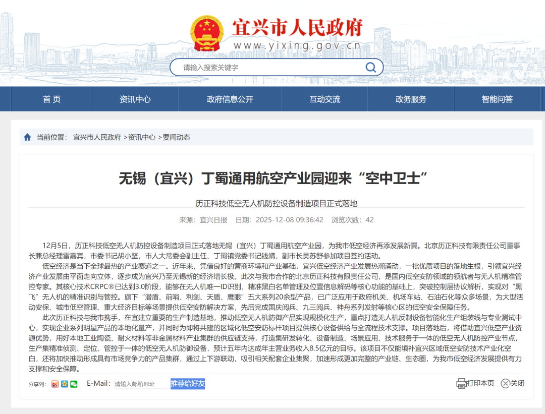 历正科技将依托无锡丁蜀通用航空产业园的区位优势与产业基础,专注低空无人机防控设备的研发与制造,助力打造集技术研发、设备生产、场景应用于一体的低空安全产业链。
