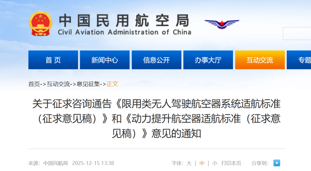 为更好地指导与规范限用类无人驾驶航空器系统及动力提升航空器的型号合格审定工作,基于前期多项审定实践经验的总结,中国民航局航空器适航审定司组织制定了以下两项咨询通告的征求意见稿,现正式向社会公开征集意见: