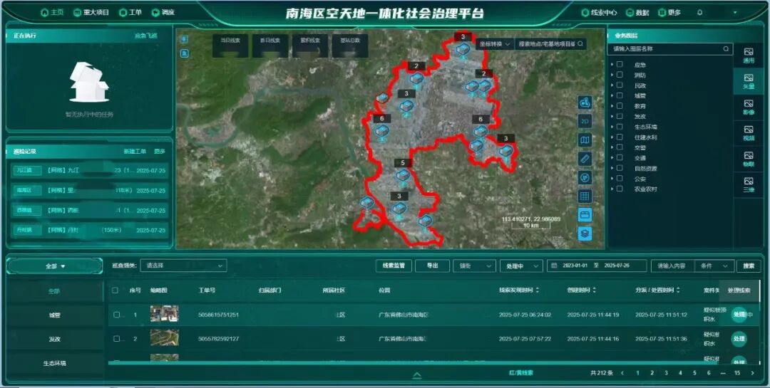 中科云图与佛山市南海区共同构建的 “空天地”一体化社会治理体系,是基于低空无人机遥感网打造的“天上看、空中拍、地上巡”一体化治理体系。该体系通过统筹卫星遥感、无人机巡检、物联网传感和地面数据,实现对城市运行状态的立体化、实时化监测与智能研判,广泛应用于生态环境保护、国土巡查、应急指挥、市容管理等多元场景,显著提升了城市治理的精准化与协同效能,是低空经济赋能区域高质量发展的生动实践。