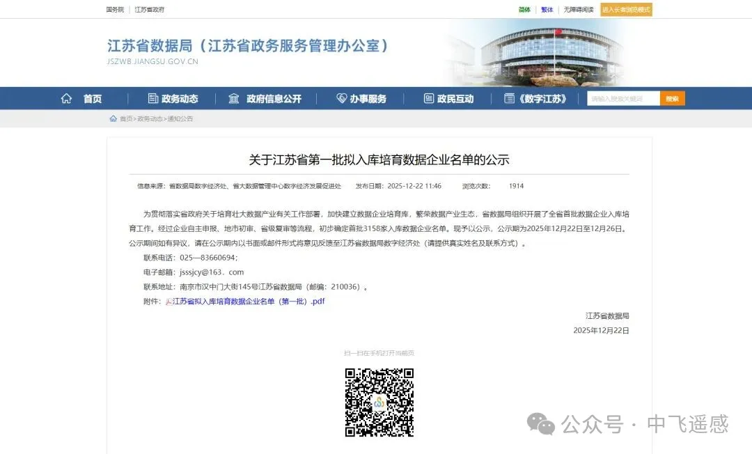 近日,江苏省数据局公布了2025年度一批拟入库培育数据企业名单,苏州中飞遥感技术服务有限公司凭借在数据技术领域的扎实积淀、创新能力与优质服务,成功入选!这既是对公司深耕遥感数据产业、践行数字经济发展理念的高度认可,更是公司迈向高质量发展新征程的重要里程碑。