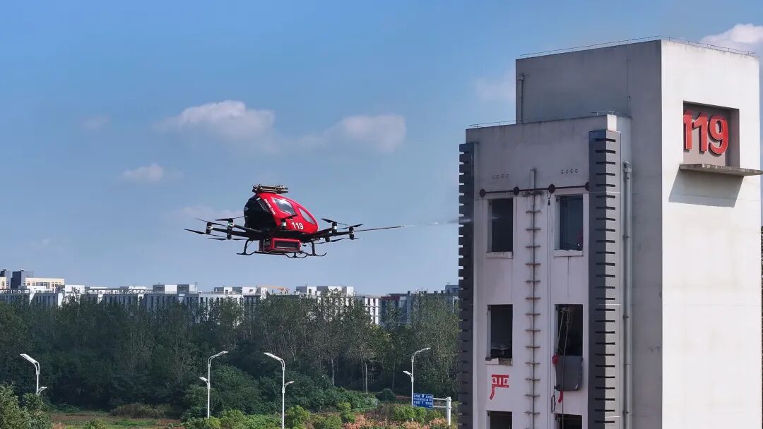 图:亿航智能EH216-F系列消防机产品在合肥开展常态化科目测试飞行