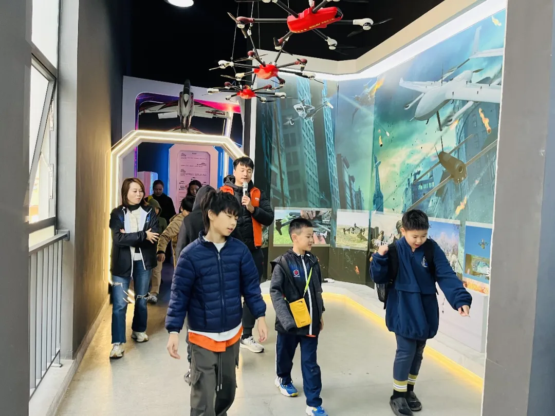 科普馆内各类无人机整齐陈列,老师结合农业植保、航拍勘探等真实案例,通俗讲解了无人机的功能用途及民商用发展历程。从早期简易机型到如今的智能无人机,孩子们听得专注,不时举手提问,对无人机世界的认知逐步清晰,科技探索的种子悄然萌芽。