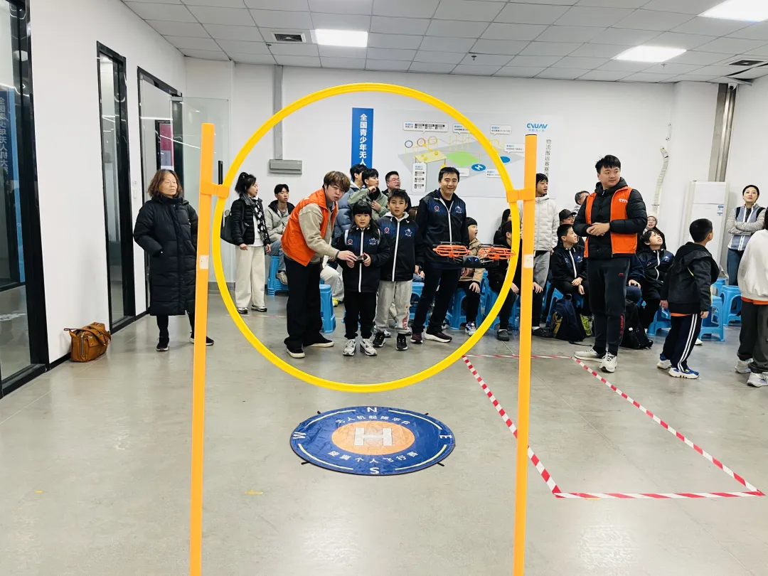 参观结束后,实操体验环节正式开启。第一站是童学机飞行,异能导师详细讲解操作要领:“左手控上下高度,右手控前后左右方向”,还亲自示范指导握遥控器姿势。孩子们上手很快,没多久就能让童学机平稳升空,经过练习成功挑战障碍穿越,实操室里满是激动的欢呼声,孩子们脸上洋溢着成就感。