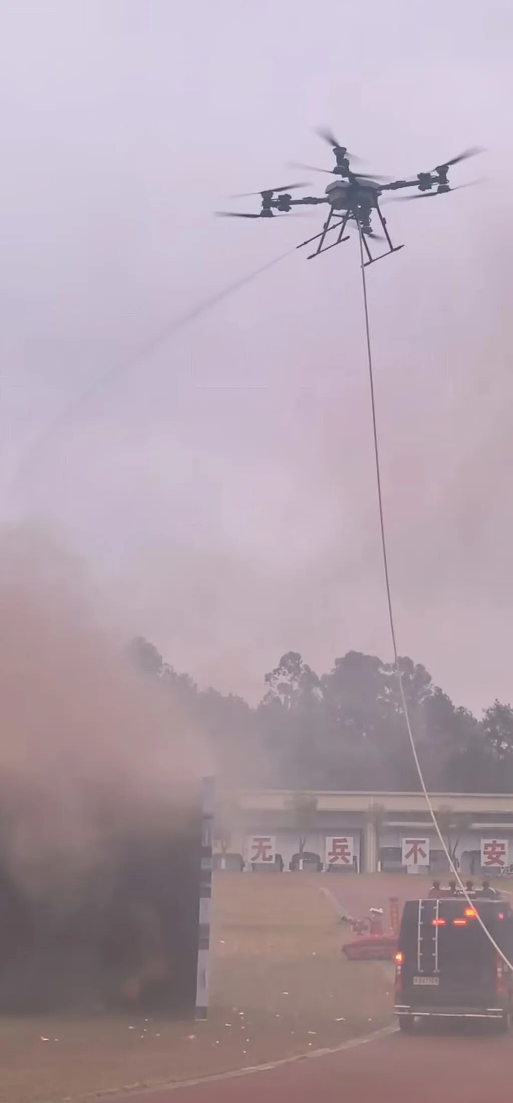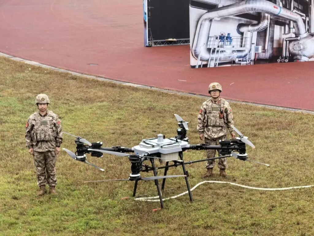 指挥所指令下达的瞬间,各救援力量迅速集结。但厂区爆炸现场环境复杂,传统灭火装备难以快速抵达核心着火点,救援陷入考验。此时,本次演练的“空中卫士”——慧明捷100KG灭火自组网无人机临危受命,缓缓升空。