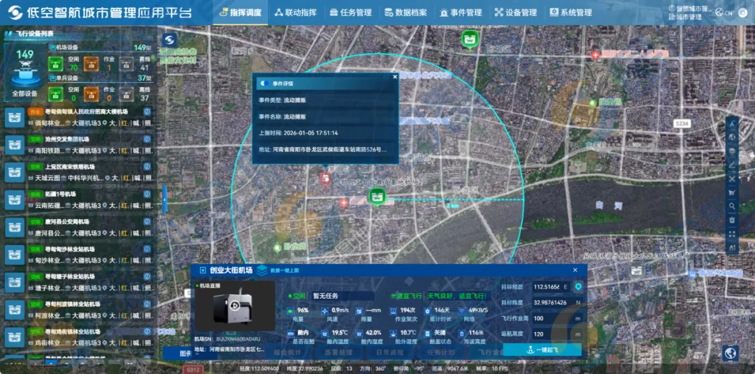 通过部署全自动无人机机场,构建起“无人值守、一键响应”的新型城市治理响应体系,实现治理力量的全天候在线、全时候待命。平台可在接到指令的瞬间自动调度空中力量,无人机在3分钟内直抵现场,大幅缩短传统人工巡查的准备与出动时间。让城市治理行动真正迈入“秒级联动、分钟到场”的新时代,使宝贵的治理窗口得到指数级提升。