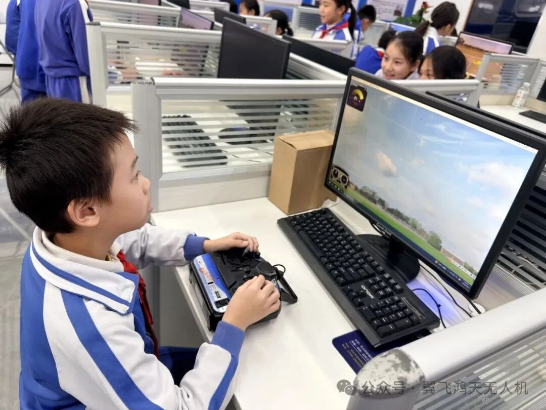 理论知识的积累,最终要落地到实践操作中。为了让同学们安全、高效地掌握飞行技巧,翼飞鸿天特意设置了无人机模拟器训练环节。