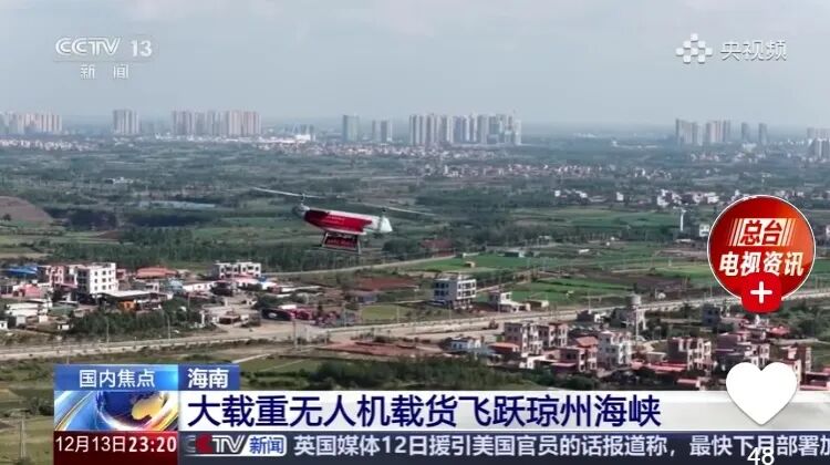➤央视新闻报道,大载重无人机载重100公斤水果和冷链冰鲜飞跃琼州海峡,实现跨海长距离飞行。