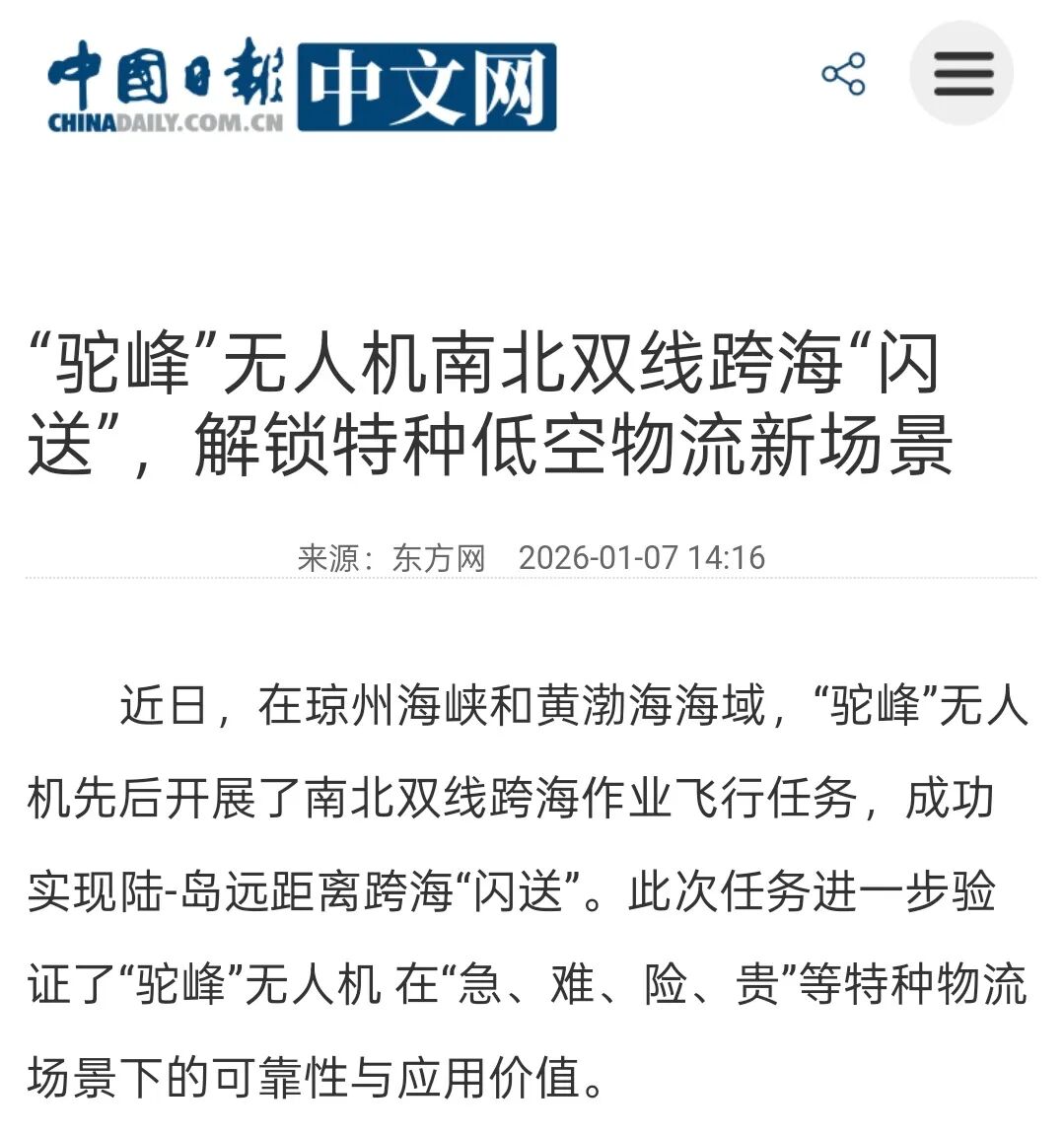 ➤中国日报-中文网报道,“驼峰”无人机南北双线跨海“闪送”,解锁特种低空物流新场景。