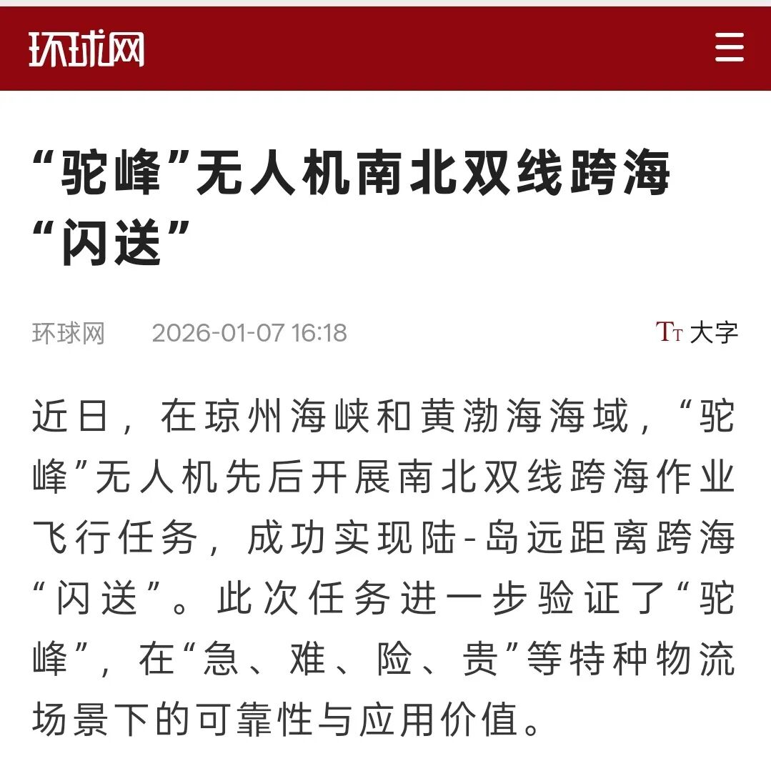 ➤环球网报道,“驼峰”无人机南北双线跨海“闪送”,进一步验证了在“急、难、险、贵”等特种物流场景下的可靠性与应用价值。