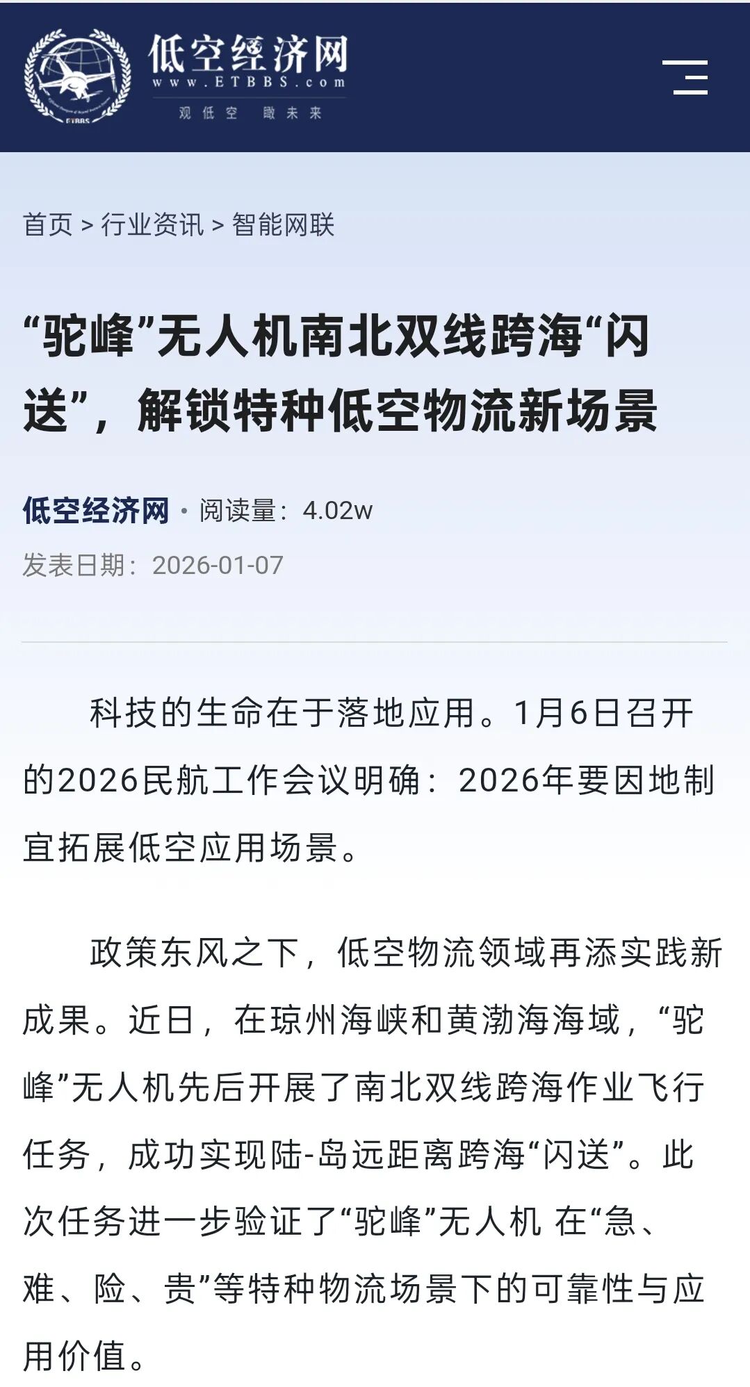 ➤低空经济网报道,民航工作会议明确:2026年要因地制宜拓展低空应用场景,政策东风之下,“驼峰”无人机成功实现跨海“闪送”,低空物流领域再添实践新成果。