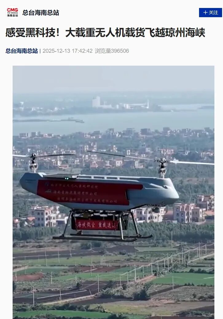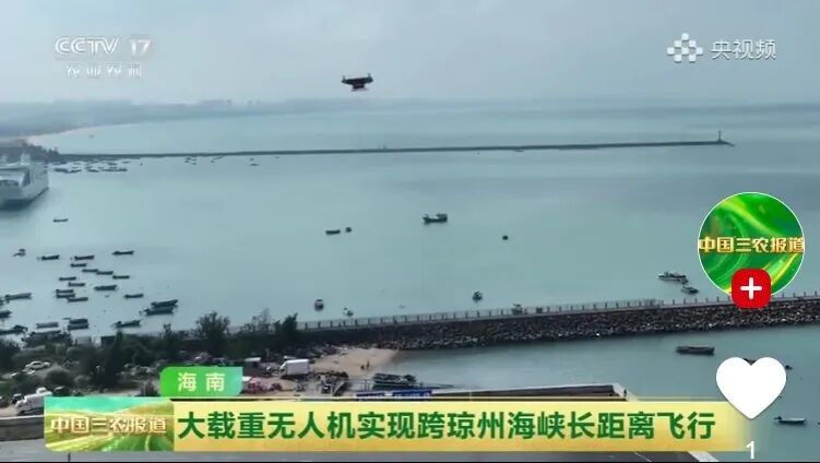 ➤央视农业报道,大载重无人机实现跨琼州海峡长距离飞行,为未来进出海南岛的紧急物资、高货值物品的第一时间运送,试通了又一条路径。