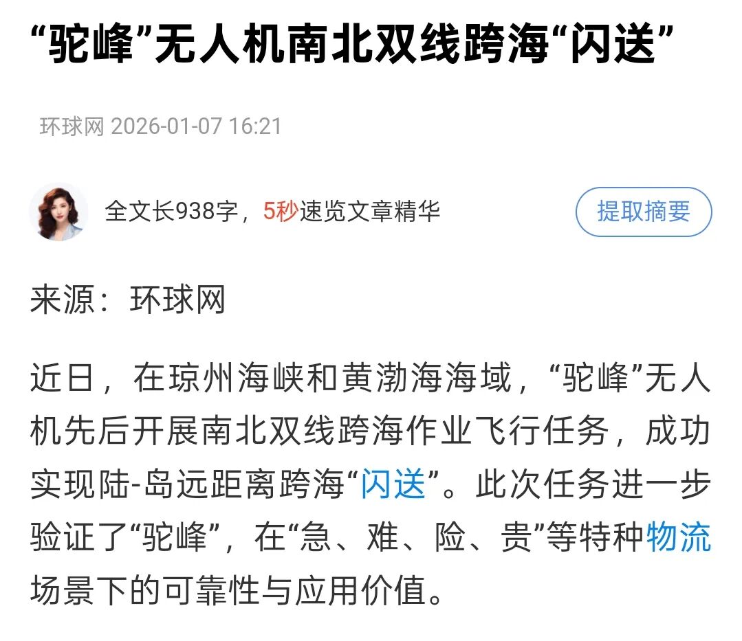 ➤新浪财经报道,“驼峰”无人机南北双线跨海任务,成功实现陆-岛远距离“闪送”。