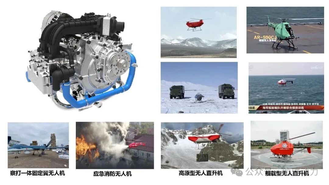 ②DB416“云雀”重油航空发动机:国内首款实现自主可控的重油航发,功率达127kW。该发动机性能优异、可靠性高,已实现批量交付,适配机型超过三十种,涵盖长航时固定翼无人机、各类无人直升机(单旋翼、纵列双旋翼、共轴反桨、交叉旋翼)、自转旋翼机、地效翼船及混合垂直起降飞行器等。在侦察打击、高原物资投送、应急消防、反恐突击、岛礁转运等高难度任务中,均展现出卓越的实力与稳定的性能。