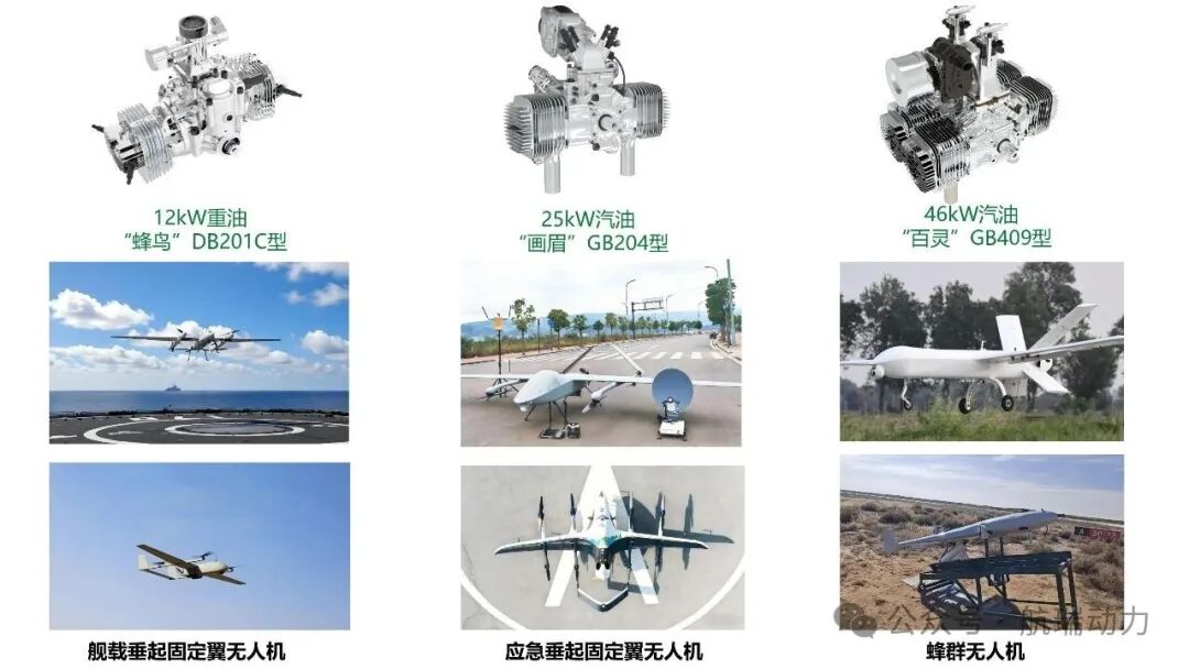 ①小马力平台(12kW-46kW):旗下“蜂鸟”、“画眉”是小马力航发平台的两缸级产品,功率段覆盖12-25kW,为海军立项动力项目、空军比测项目提供关键动力支持,目前已搭载于多型垂直起降无人机、弹射起飞无人机等工业级无人机平台并实现稳定作业应用。该平台的四缸级产品“百灵”,功率达46kW,适用于200-300kg级的蜂群无人机、岛礁/舰载/高原部署的小型长航时固定翼或垂直起降无人机,为特种应用场景提供了高效可靠的动力选择。
