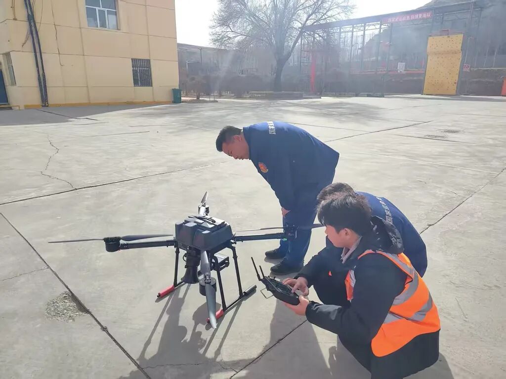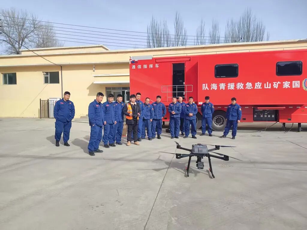 交付现场,慧明捷技术团队与青海队救援骨干协同开展设备调试与性能校验。通过精准操控,云鹰无人机灵活升空,其搭载的双光云台可实现高清成像与红外热成像双重功能,将现场实时画面无延迟传输至地面通信指挥车,为指挥中心构建起“空中视角+地面调度”的一体化指挥链路。同时,技术人员逐一测试喊话器的远距离语音播报效果与投掷器的精准投放能力,确保设备在紧急情况下可实现被困人员引导、救援物资投送等多元任务,全面验证了无人机在高原矿山场景下的可靠性能。