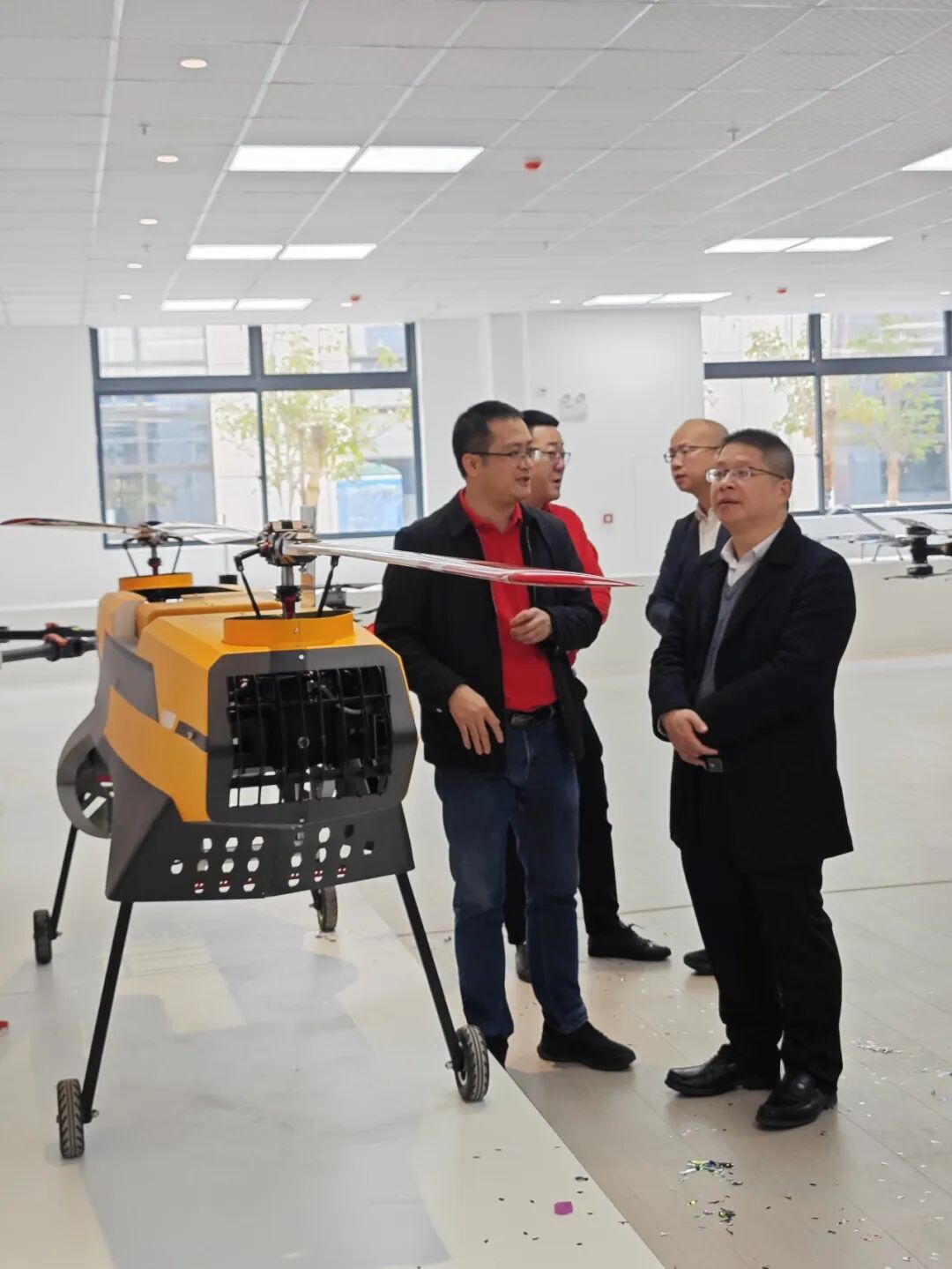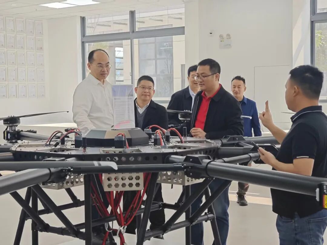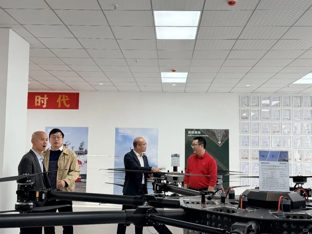 随后,来宾一行参观了企业办公与展示区域,围绕低空装备能力、应急应用场景及未来发展规划进行深入交流。通过现场讲解与互动沟通,进一步了解容祺智能在工业级无人机研发制造、应急实战应用及系统化运行保障等方面的综合实力与实践成果。