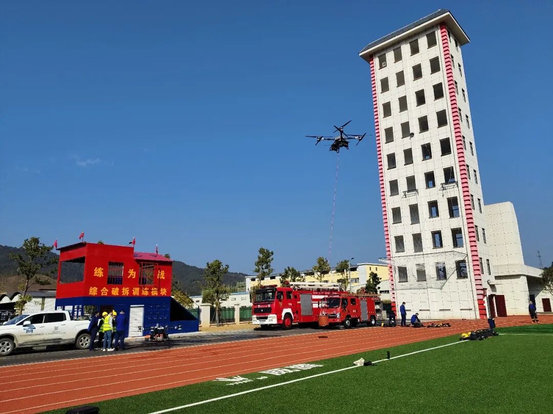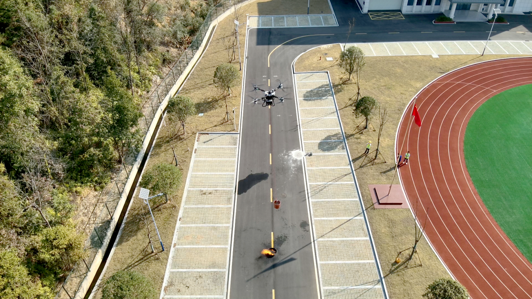测试现场,随着轰鸣声响起,技术人员熟练操控设备,大载荷消防无人机挂载消防水带升空,搭建“空中水龙”对模拟火势区域持续喷洒,全面检验无人机重载能力及空中供水的续航、覆盖效能,破解山区地面供水难、抵达慢的痛点。随后,玻璃破碎弹投射、远程取水灭火、物资运送等项目有序开展,全程凸显科技赋能消防的硬核实力。
