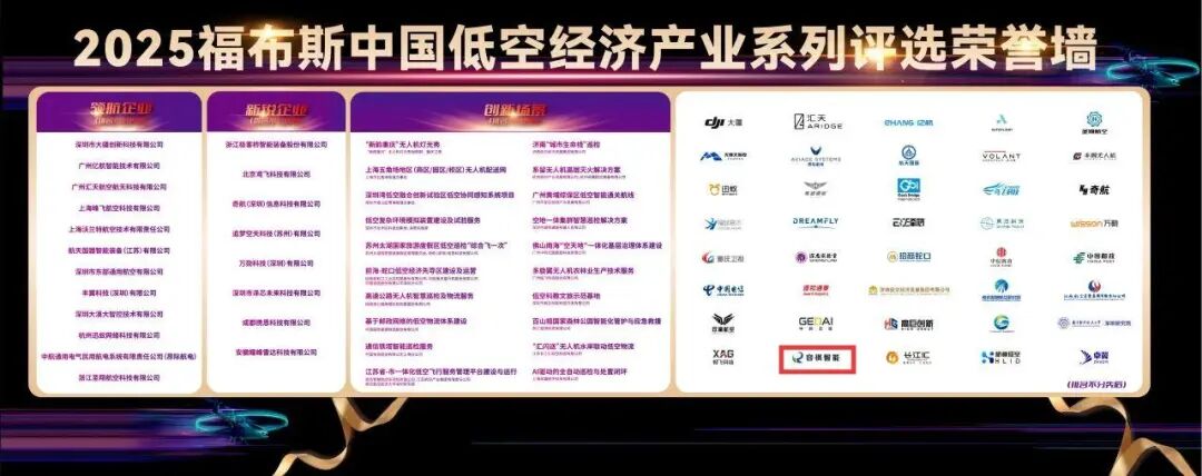 该奖项由福布斯中国发起,聚焦低空经济领域具有示范意义和推广价值的创新应用场景,重点考察项目在技术创新、场景落地、社会价值及可复制性等方面的综合表现。本次获奖,充分体现了容祺智能在低空智能装备与行业场景深度融合方面的技术实力与实践成果。