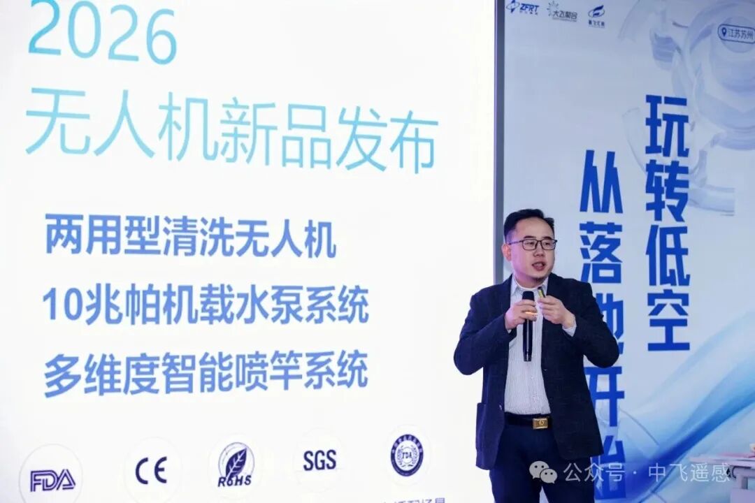 当前,低空经济正处于政策红利持续释放、产业化应用加速落地的关键阶段,城市治理、公共安全、能源运维与建筑维护等领域对“更安全、更高效、更可落地”的低空作业能力提出了更高要求。苏州中飞遥感坚持以技术创新为驱动、以场景价值为导向,本次发布会集中推出两大类核心产品:AI+无人机建筑安全智能巡检一体化平台与两用型清洗无人机产品体系,面向城市建筑安全检测与高空清洗两大高频刚需场景,提供更系统化、更工程化的解决方案。