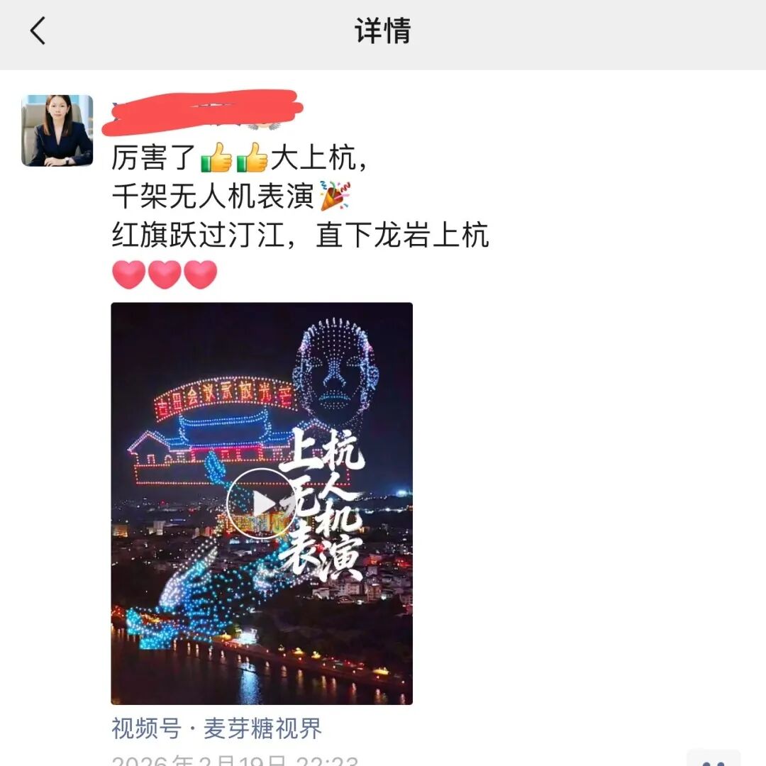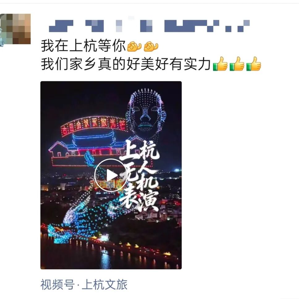 在社交平台上,这场无人机秀更是刷屏朋友圈,大家纷纷分享观演照片与视频,点赞上杭文旅的用心与创意,「上杭春节太会了」「汀江无人机秀值得 N 刷」「这才是新春该有的样子」等评论成为主流,为上杭文旅积攒了超高口碑。