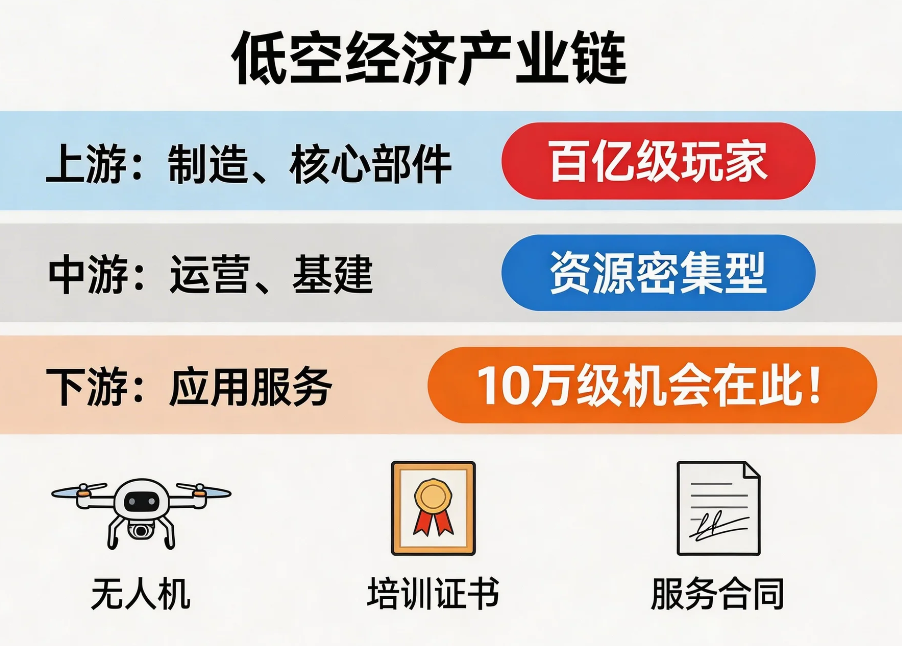 10万元,显然无法涉足飞行器制造或低空基建。我们的核心策略应该是:利用专业技能,聚焦产业链最下游的“应用服务”环节。