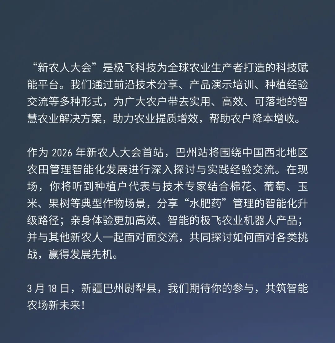 极飞的愿景是,构建一个满足人类未来 100 年发展需求的农业生态系统,让全世界的人们都能获得充足、丰富和安全的食物。成立 14 年来,极飞自主研发了农业无人机、农业无人车、农机自驾仪、农业物联网和智慧农业管理系统等产品。通过构建完善的渠道体系,为农户提供智能、高效、经济的生产工具和数据服务;帮助农场解决劳动力成本高、生产管理粗放等问题。