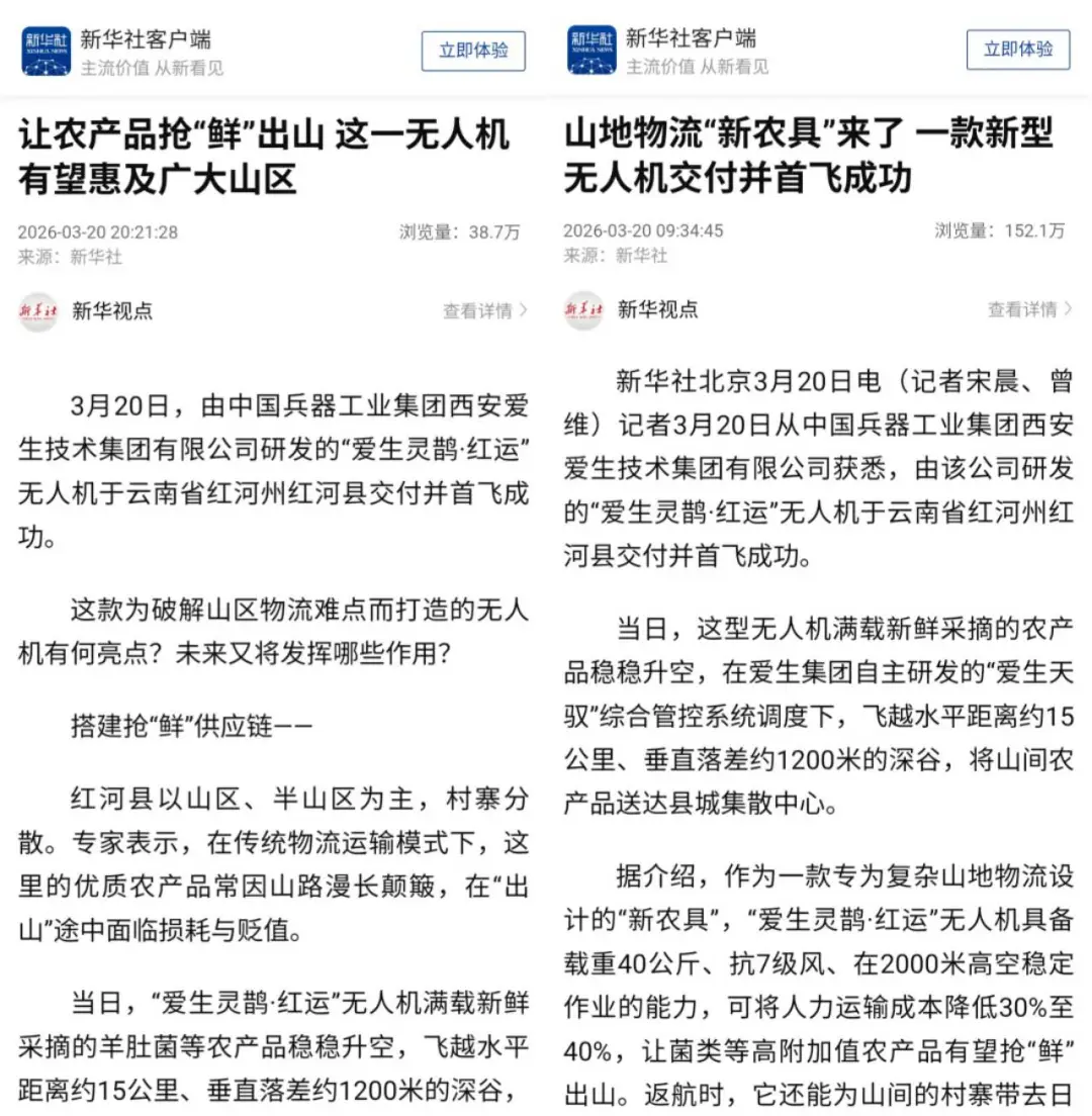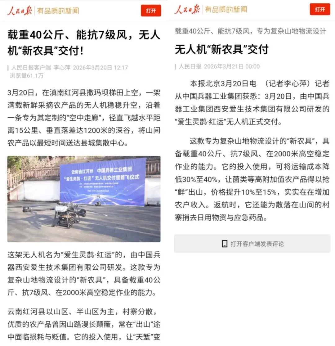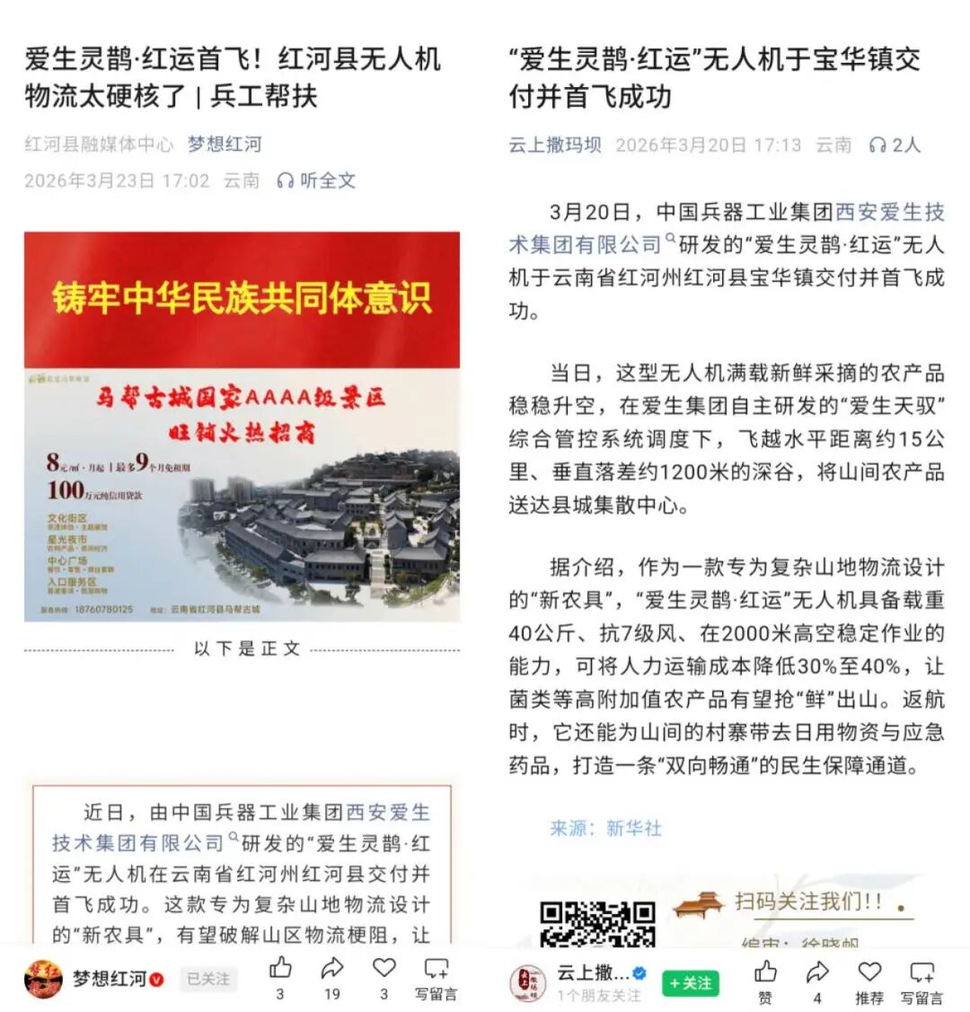 3月20日,由爱生集团所属无人机公司为云南省红河县定制研发的“爱生灵鹊·红运”无人运输机成功交付。该型无人机在爱生集团完全自主研发的“爱生天驭”综合管控系统的调度下,圆满完成了首次运送任务,获得各大媒体广泛报道。