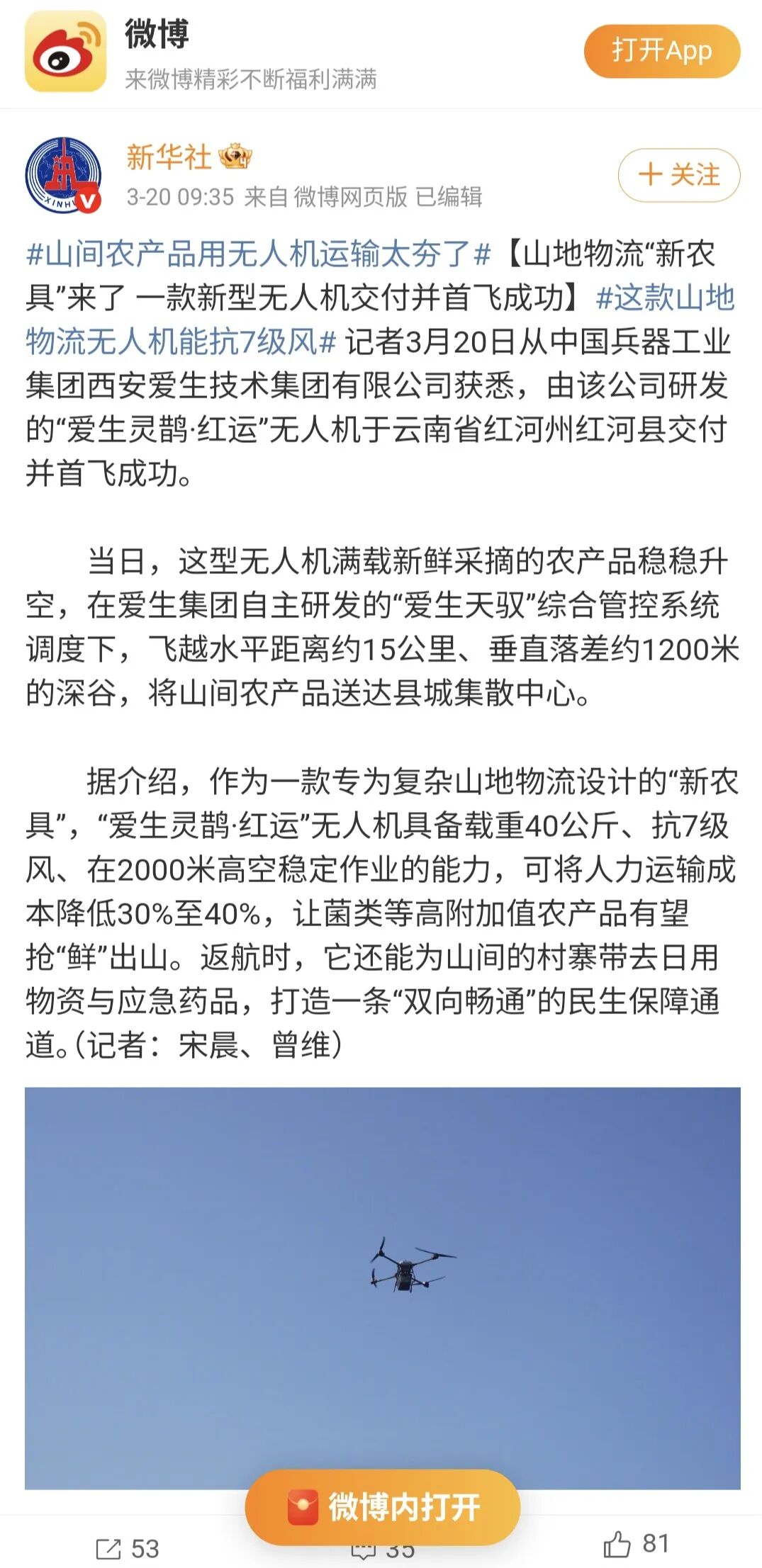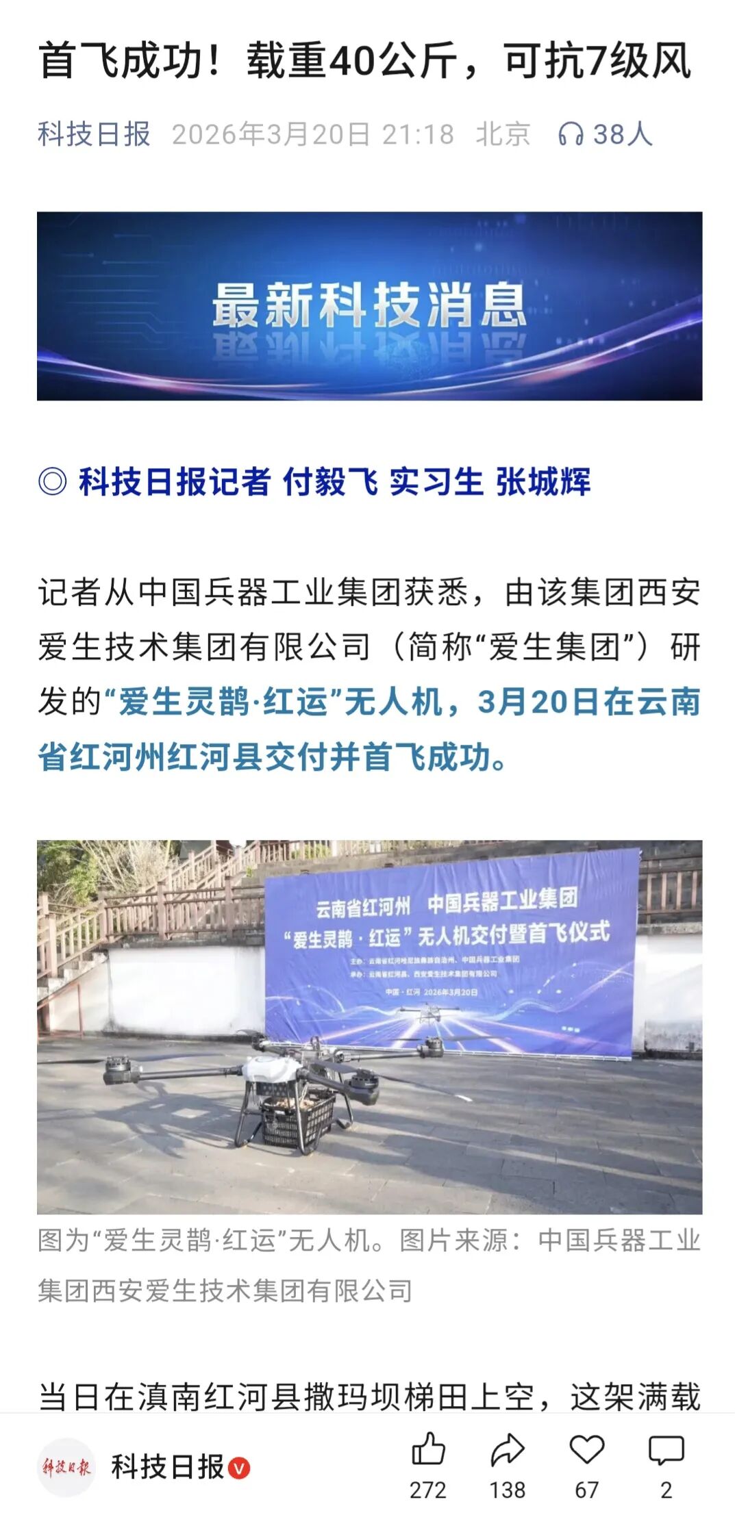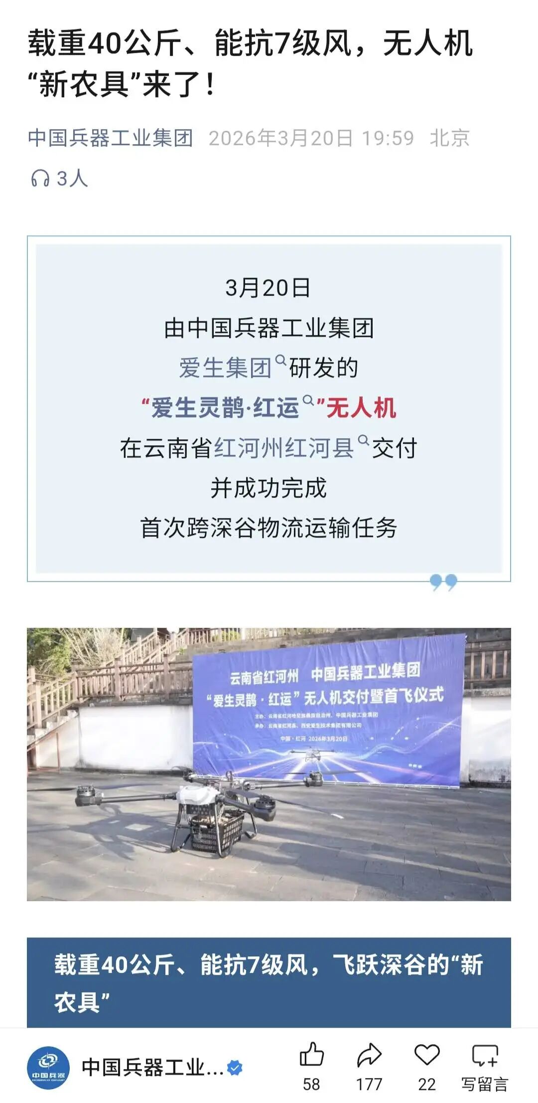 3月20日,由爱生集团所属无人机公司为云南省红河县定制研发的“爱生灵鹊·红运”无人运输机成功交付。该型无人机在爱生集团完全自主研发的“爱生天驭”综合管控系统的调度下,圆满完成了首次运送任务,获得各大媒体广泛报道。