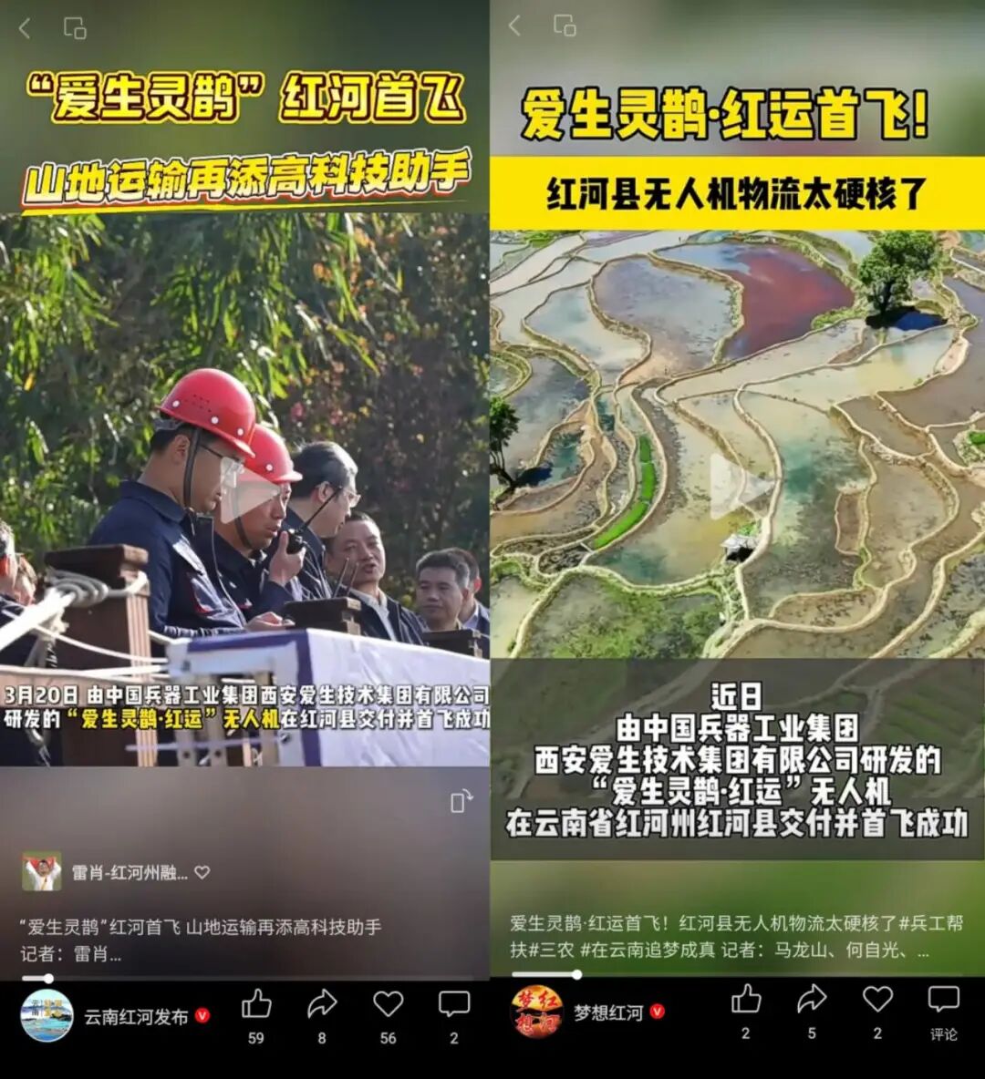 央视新闻客户端、新华社客户端与微博、《人民日报》客户端、《科技日报》微信公众号等中央主流媒体,以及集团公司微信公众号、红河县相关媒体等对“爱生灵鹊·红运”交付并成功首飞进行了报道。