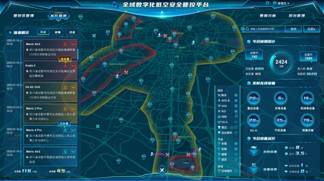 黄色管控区:敏感区为监管第二层级,涵盖起降点、航路枢纽及临时保障场所,在合作式感知基础上叠加主动感知,通过雷达、光电、无线电监测等多源验证。管控以预警驱离为主,采用定向广播等软手段引导返航;警告无效则自动触发第三层级应急处置。