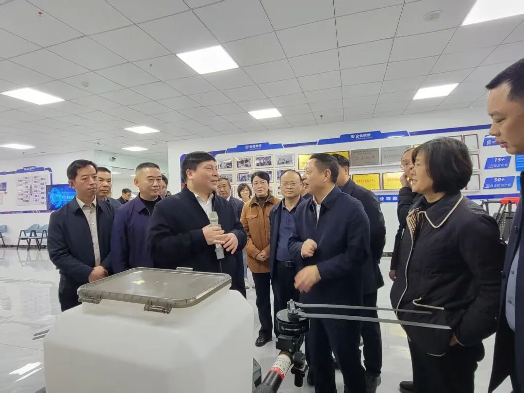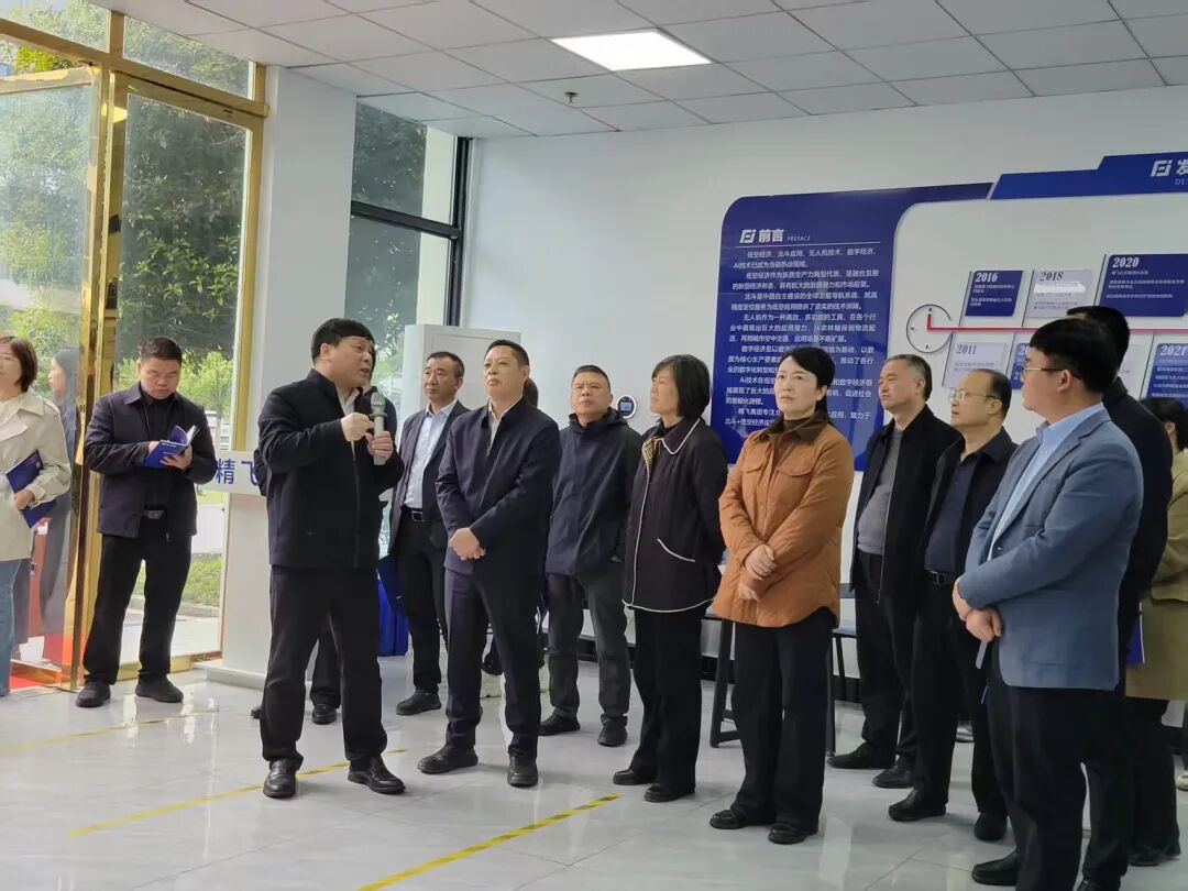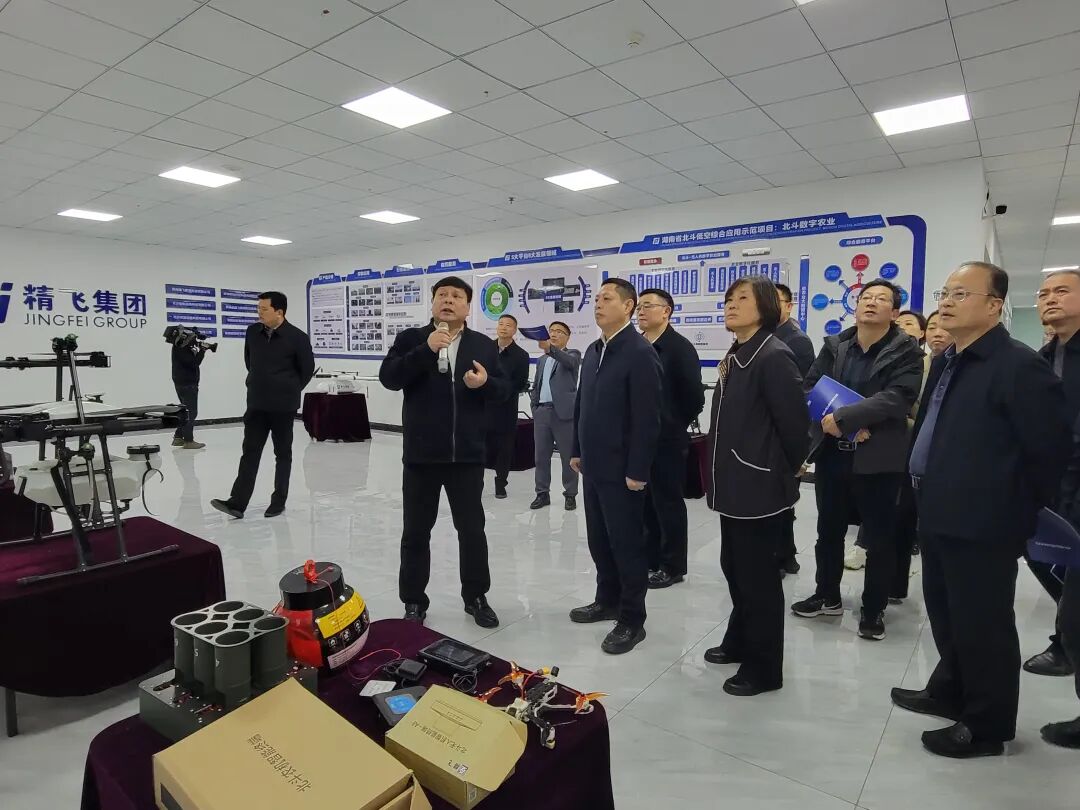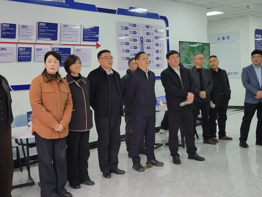 2026年4月2日,为加速推进农业现代化,助力乡村振兴战略实施,娄底市人民政府副市长伍鹄、市政府副秘书长梁伍明率市农业农村局、科技局、工信局等部门负责人及农业领域专家代表共60余人,赴精飞集团涟源生产基地开展专题调研。精飞集团董事长龙永坚全程陪同,通过企业展厅参观、技术演示及实景操作等环节,全面展示了精飞集团在低空经济领域的创新成果与实践应用。